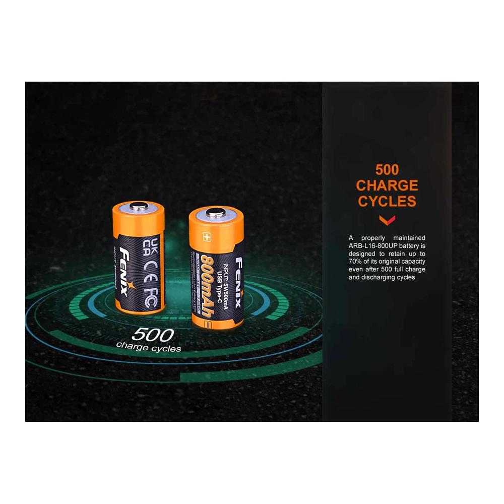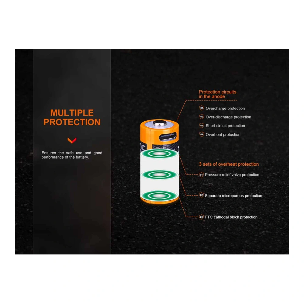 Kvaliteetne USB-C otselaadimispordiga tüüp 16340 liitium-ioonaku. Kaitsemehhanism tagab, et aku ei kuumeneks ega laeks üle. Isetühjenemine on viidud miinimumini, eluiga üle 500 laadimistsükli. Testitud nii külmades, kui kuumades keskkonnatingimustes.