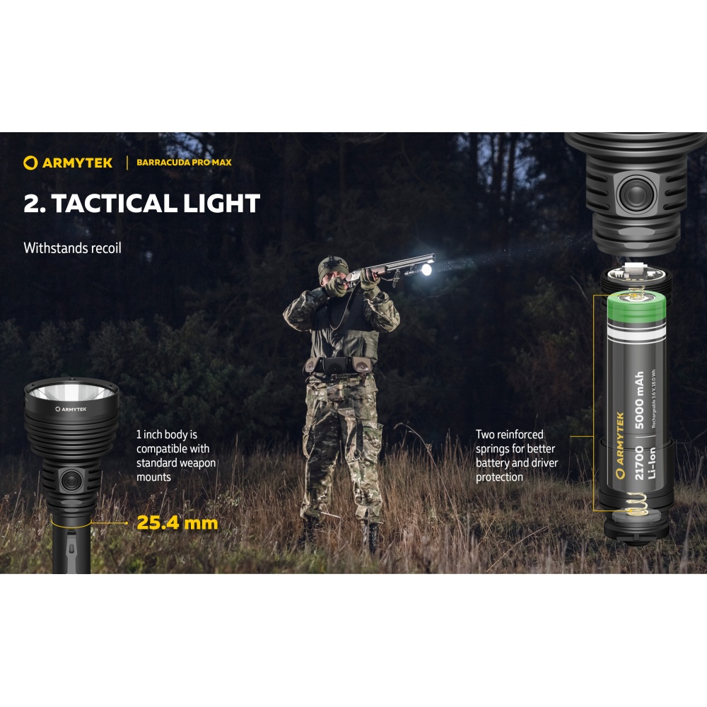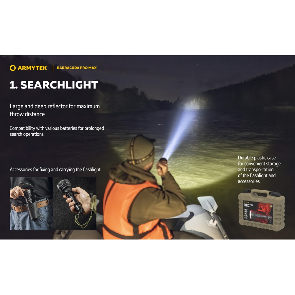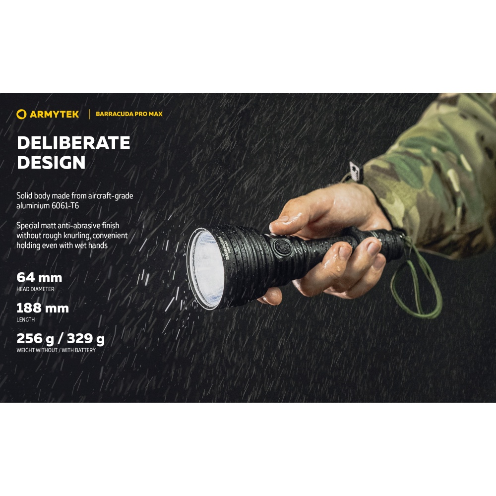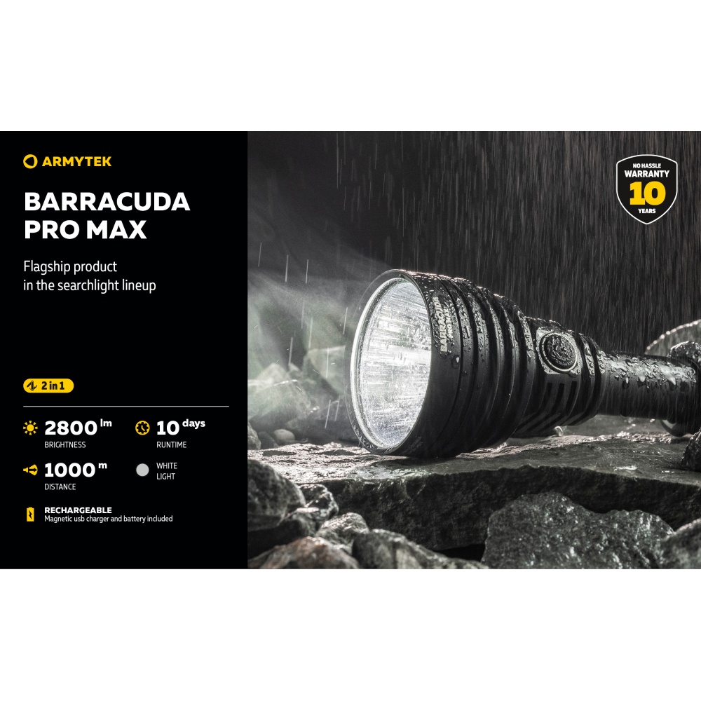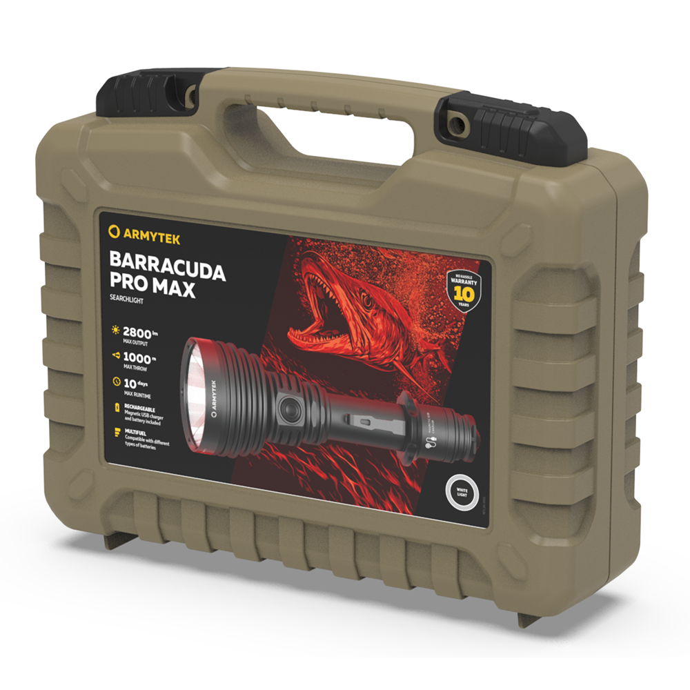 Armytek Barracuda Pro Max Magnet USB PCB on Armyteki uusima põlvkonna taktikalise suunitlusega otsingulamp. Esmakordselt Armyteki ajaloos on Barracuda otsingulamp saanud lisaks tagumisele taktikalisele lülitile ka külglüliti, mis muudab lambiga opereerimise tavakasutajatele mugavamaks ning kiiremaks. Barracuda on tugevakonstruktsiooniline, kompaktne ning eeskujuliku jõudlusega. Valgusjoonis on otsingulambile iseloomuliku tugevalt kontsentreeritud keskosaga (4 kraadi) ja vähemvalgustatud äärealadega (55 kraadi) maksimeerimiseks lambi suutlikkust just tööks keskmistel ja kaugetel distantsidel. Kontsentreeritud valguspunkti diameeter 100 meetri kaugusel on 7 meetrit. Maksimaalseks valgusvõimsuseks on 2800 luumenit ning maksimaalseks valgusvoo ulatuseks koguni 1000 meetrit (1km). Tänu suure mahutavusega akule ja kvaliteetsele toitesüsteemile ulatub Barracuda tööaeg ühe laadimisega minimaalsel 5 luumenilisel valgusvõimsusel kümne järjestikuse ööpäevani (240h). Valgustugevus on täielikult stabiliseeritud ja konstantse tugevusega igal töörežiimil. Kasutajaliides on lihtne ning saadaval on neli erinevat valgustugevust ning peidetud stroborežiim. Barracuda on üleni metallist korpusega vee- ja ilmastikukindel taskulamp pikkusega 188mm, pea diameetriga 64mm ja korpuse läbimõõduga 1" ehk 25,4mm. Barracuda Pro Max on testitud 25m sügavusel vees 5 tunni jooksul ning kukkumisele 25m kõrguselt. Toiteallikana kasutab lamp standardset vahetatavat tüüp 21700 Li-ion akut, kuid on võimeline töötama läbi komplekti kuuluva adapteri ka tüüp 18650 Li-ion akult ning kahelt CR123A liitiumpatareilt. Laadimiseks ei pea akut lambist eemaldama. Magnetkinnitusega laadimiskaabel kinnitub hetkega lambi tagaosa metallpindadega lüliti külge ning lamp on laetav läbi standardse USB väljundit omava toiteallika. Kiirlaadimisvõimekus võimaldab tühja 5000mAh aku täis laadida kõigest 2 tunni ja 45 minutiga. Lisaks omab Barracuda aku tühjenemise hoiatusfunktsiooni ja lambi automaatest ülekuumenemise eest kaitsevat süsteemi. Lisavarustusena on Barracuda kohanduv erinevate relvakinnitustega, jalgrattakinnitustega ja distantslülititega. Lambi standardsesse täiskomplekti kuulub lisaks valgustile Armyteki 5000mAh mahutavusega tüüp 21700 Li-ion aku, magnetlaadimiskaabel, käepael, vöövutlar, taktikaline rõngas, tagavara rõngastihendid, taskuklamber, väiksema toiteallika adapter, kasutusjuhend ning plastikust kandekohver.
