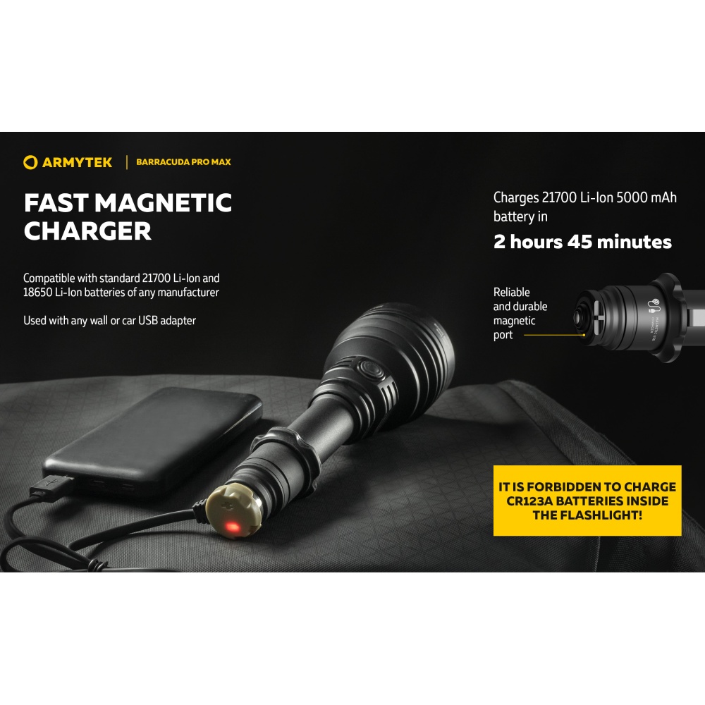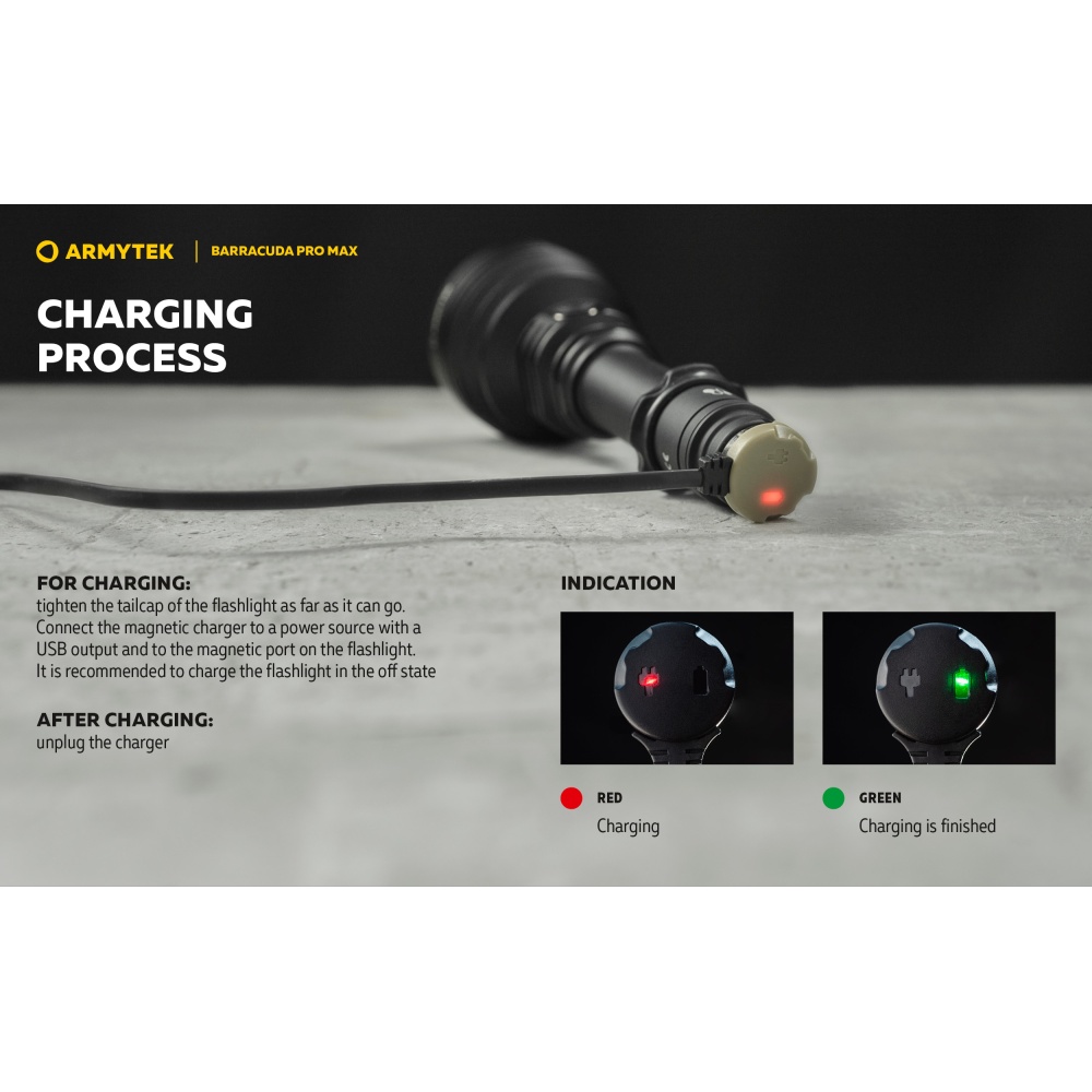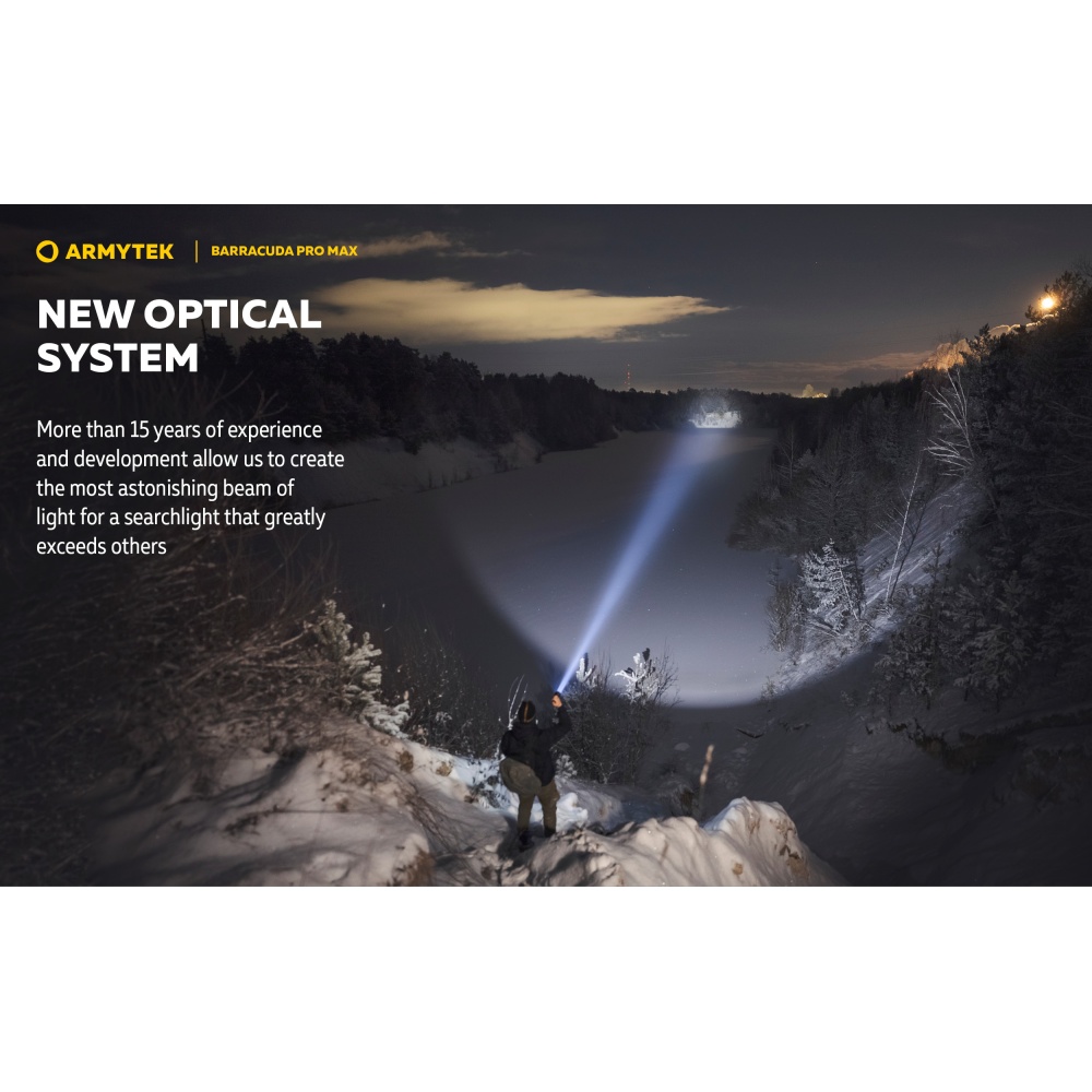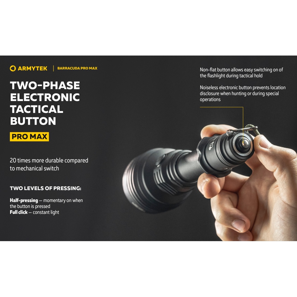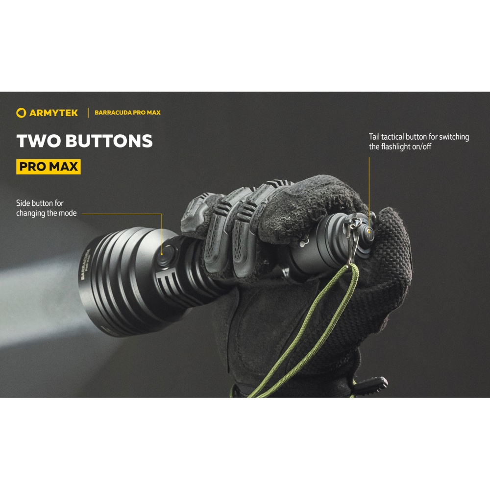 Armytek Barracuda Pro Max Magnet USB PCB on Armyteki uusima põlvkonna taktikalise suunitlusega otsingulamp. Esmakordselt Armyteki ajaloos on Barracuda otsingulamp saanud lisaks tagumisele taktikalisele lülitile ka külglüliti, mis muudab lambiga opereerimise tavakasutajatele mugavamaks ning kiiremaks. Barracuda on tugevakonstruktsiooniline, kompaktne ning eeskujuliku jõudlusega. Valgusjoonis on otsingulambile iseloomuliku tugevalt kontsentreeritud keskosaga (4 kraadi) ja vähemvalgustatud äärealadega (55 kraadi) maksimeerimiseks lambi suutlikkust just tööks keskmistel ja kaugetel distantsidel. Kontsentreeritud valguspunkti diameeter 100 meetri kaugusel on 7 meetrit. Maksimaalseks valgusvõimsuseks on 2800 luumenit ning maksimaalseks valgusvoo ulatuseks koguni 1000 meetrit (1km). Tänu suure mahutavusega akule ja kvaliteetsele toitesüsteemile ulatub Barracuda tööaeg ühe laadimisega minimaalsel 5 luumenilisel valgusvõimsusel kümne järjestikuse ööpäevani (240h). Valgustugevus on täielikult stabiliseeritud ja konstantse tugevusega igal töörežiimil. Kasutajaliides on lihtne ning saadaval on neli erinevat valgustugevust ning peidetud stroborežiim. Barracuda on üleni metallist korpusega vee- ja ilmastikukindel taskulamp pikkusega 188mm, pea diameetriga 64mm ja korpuse läbimõõduga 1" ehk 25,4mm. Barracuda Pro Max on testitud 25m sügavusel vees 5 tunni jooksul ning kukkumisele 25m kõrguselt. Toiteallikana kasutab lamp standardset vahetatavat tüüp 21700 Li-ion akut, kuid on võimeline töötama läbi komplekti kuuluva adapteri ka tüüp 18650 Li-ion akult ning kahelt CR123A liitiumpatareilt. Laadimiseks ei pea akut lambist eemaldama. Magnetkinnitusega laadimiskaabel kinnitub hetkega lambi tagaosa metallpindadega lüliti külge ning lamp on laetav läbi standardse USB väljundit omava toiteallika. Kiirlaadimisvõimekus võimaldab tühja 5000mAh aku täis laadida kõigest 2 tunni ja 45 minutiga. Lisaks omab Barracuda aku tühjenemise hoiatusfunktsiooni ja lambi automaatest ülekuumenemise eest kaitsevat süsteemi. Lisavarustusena on Barracuda kohanduv erinevate relvakinnitustega, jalgrattakinnitustega ja distantslülititega. Lambi standardsesse täiskomplekti kuulub lisaks valgustile Armyteki 5000mAh mahutavusega tüüp 21700 Li-ion aku, magnetlaadimiskaabel, käepael, vöövutlar, taktikaline rõngas, tagavara rõngastihendid, taskuklamber, väiksema toiteallika adapter, kasutusjuhend ning plastikust kandekohver.