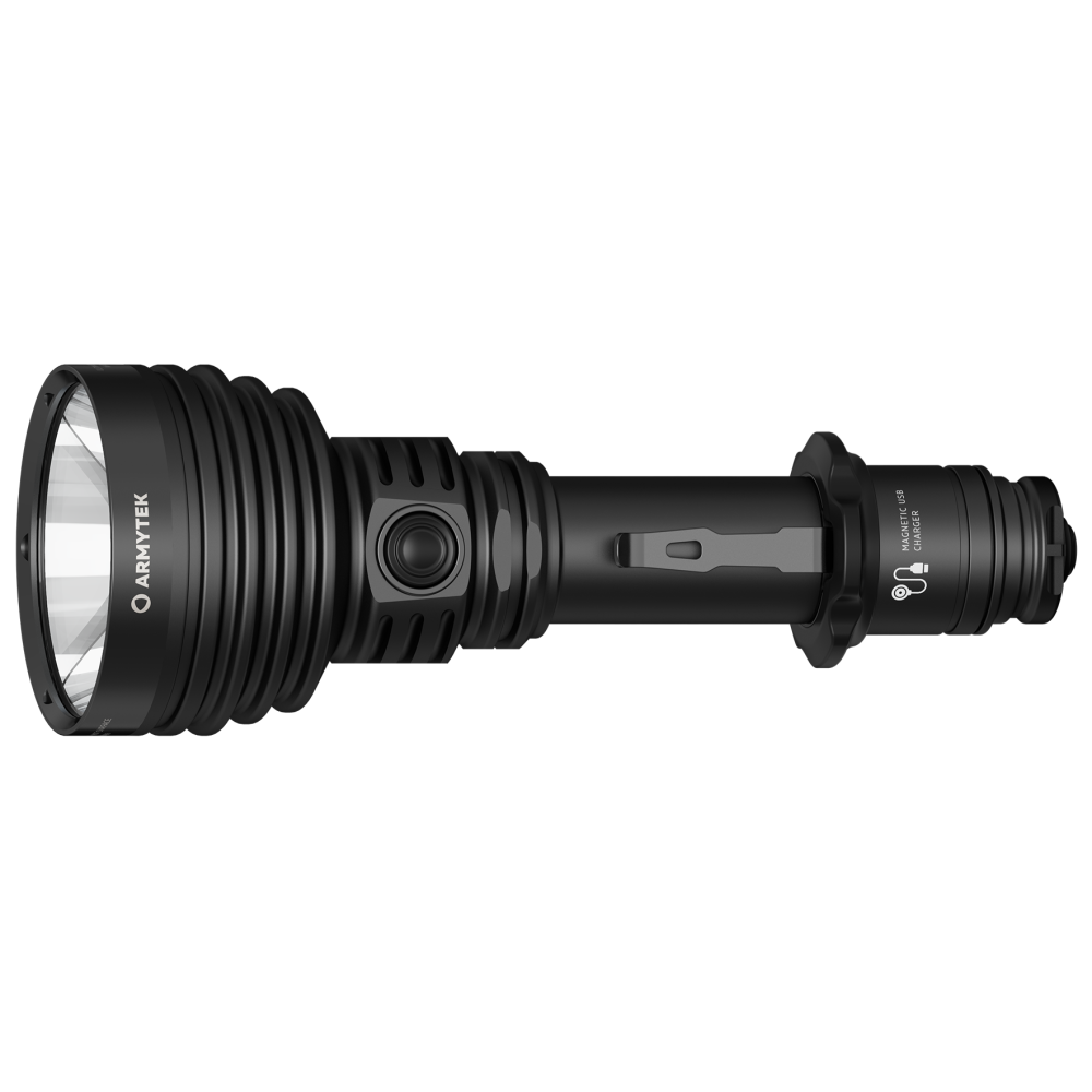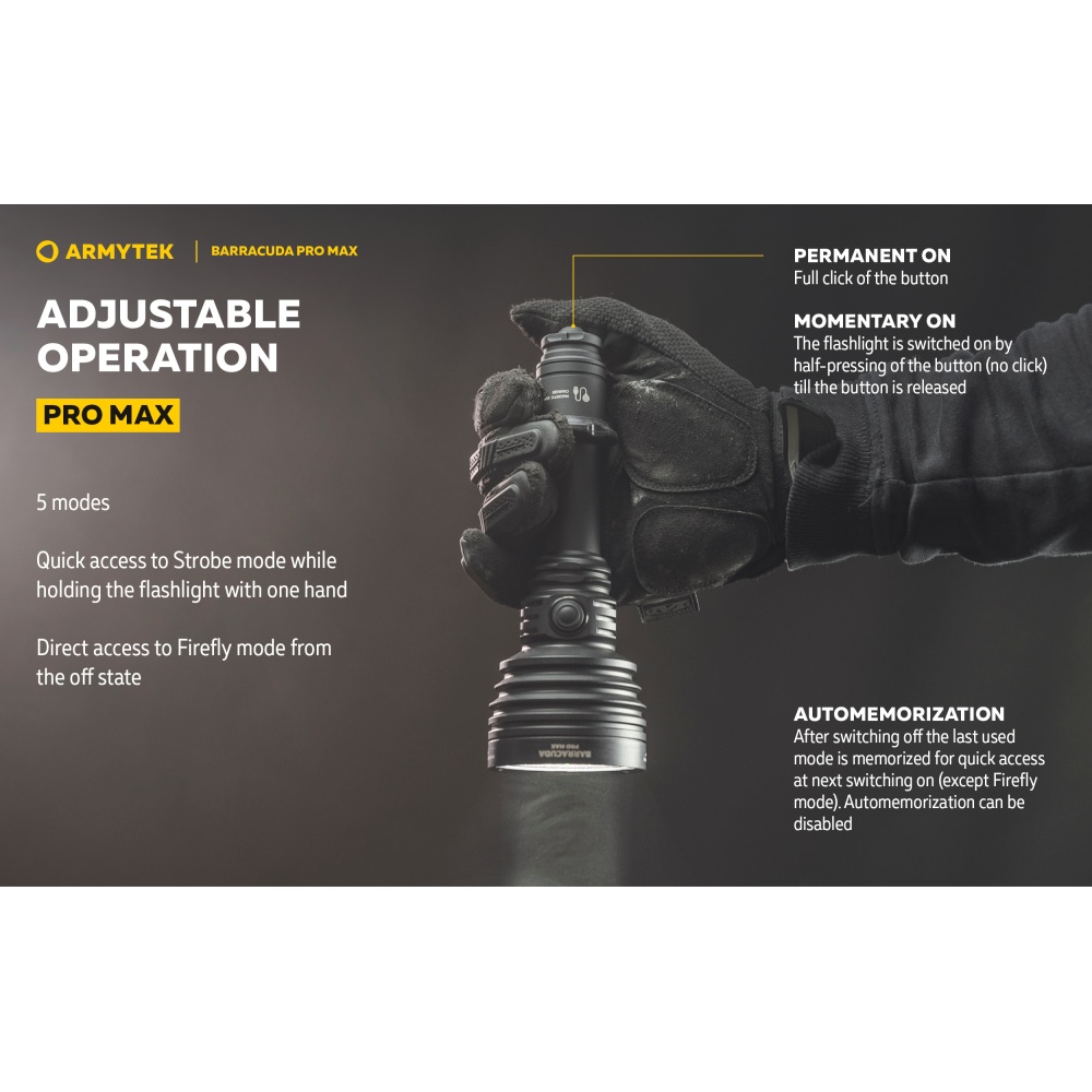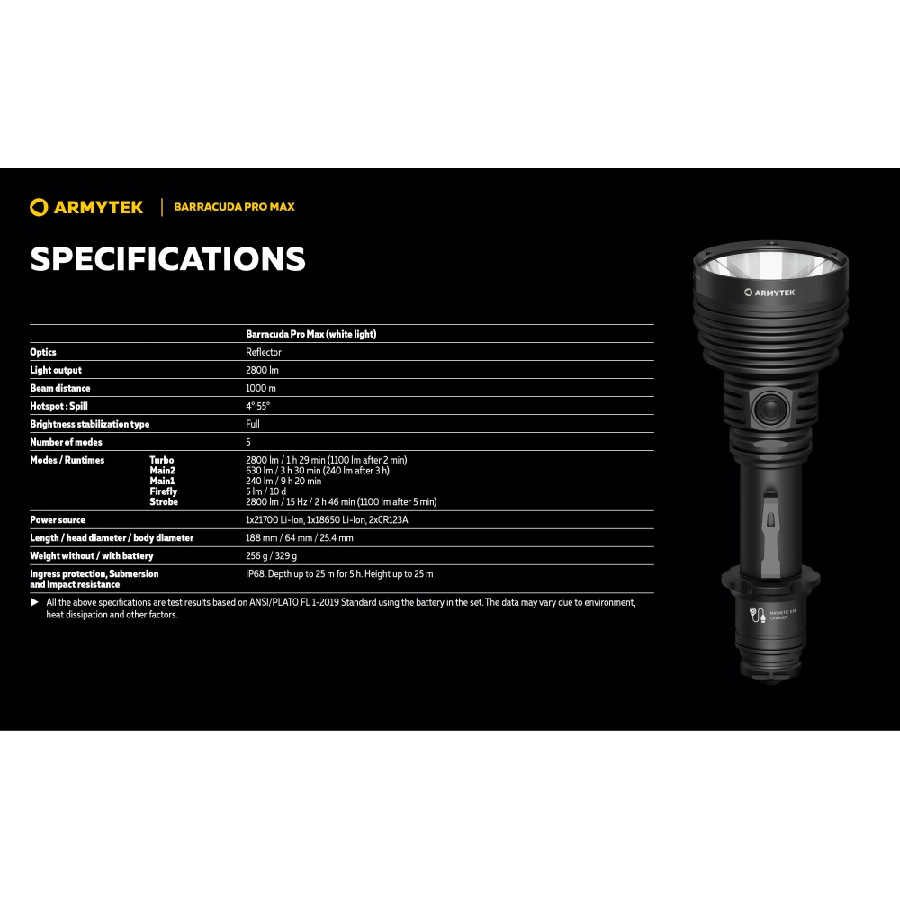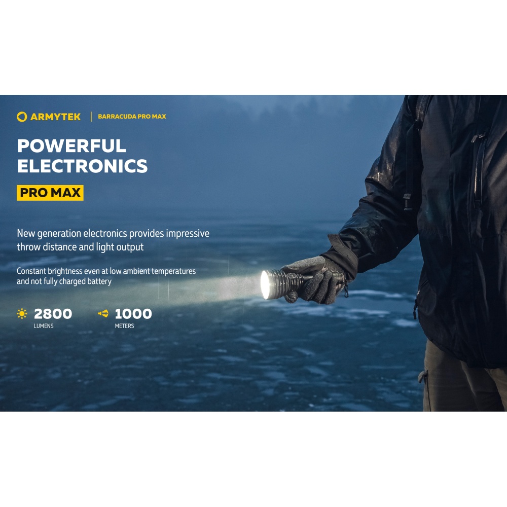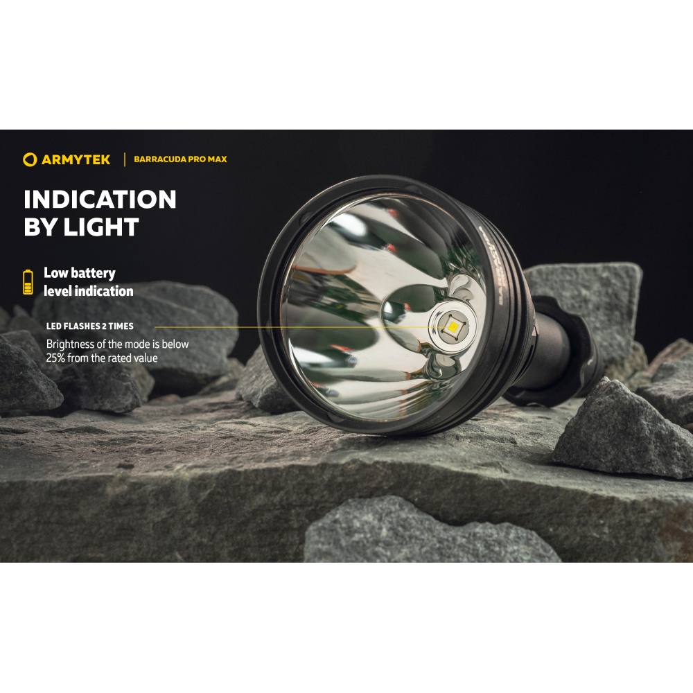 Armytek Barracuda Pro Max Magnet USB PCB on Armyteki uusima põlvkonna taktikalise suunitlusega otsingulamp. Esmakordselt Armyteki ajaloos on Barracuda otsingulamp saanud lisaks tagumisele taktikalisele lülitile ka külglüliti, mis muudab lambiga opereerimise tavakasutajatele mugavamaks ning kiiremaks. Barracuda on tugevakonstruktsiooniline, kompaktne ning eeskujuliku jõudlusega. Valgusjoonis on otsingulambile iseloomuliku tugevalt kontsentreeritud keskosaga (4 kraadi) ja vähemvalgustatud äärealadega (55 kraadi) maksimeerimiseks lambi suutlikkust just tööks keskmistel ja kaugetel distantsidel. Kontsentreeritud valguspunkti diameeter 100 meetri kaugusel on 7 meetrit. Maksimaalseks valgusvõimsuseks on 2800 luumenit ning maksimaalseks valgusvoo ulatuseks koguni 1000 meetrit (1km). Tänu suure mahutavusega akule ja kvaliteetsele toitesüsteemile ulatub Barracuda tööaeg ühe laadimisega minimaalsel 5 luumenilisel valgusvõimsusel kümne järjestikuse ööpäevani (240h). Valgustugevus on täielikult stabiliseeritud ja konstantse tugevusega igal töörežiimil. Kasutajaliides on lihtne ning saadaval on neli erinevat valgustugevust ning peidetud stroborežiim. Barracuda on üleni metallist korpusega vee- ja ilmastikukindel taskulamp pikkusega 188mm, pea diameetriga 64mm ja korpuse läbimõõduga 1" ehk 25,4mm. Barracuda Pro Max on testitud 25m sügavusel vees 5 tunni jooksul ning kukkumisele 25m kõrguselt. Toiteallikana kasutab lamp standardset vahetatavat tüüp 21700 Li-ion akut, kuid on võimeline töötama läbi komplekti kuuluva adapteri ka tüüp 18650 Li-ion akult ning kahelt CR123A liitiumpatareilt. Laadimiseks ei pea akut lambist eemaldama. Magnetkinnitusega laadimiskaabel kinnitub hetkega lambi tagaosa metallpindadega lüliti külge ning lamp on laetav läbi standardse USB väljundit omava toiteallika. Kiirlaadimisvõimekus võimaldab tühja 5000mAh aku täis laadida kõigest 2 tunni ja 45 minutiga. Lisaks omab Barracuda aku tühjenemise hoiatusfunktsiooni ja lambi automaatest ülekuumenemise eest kaitsevat süsteemi. Lisavarustusena on Barracuda kohanduv erinevate relvakinnitustega, jalgrattakinnitustega ja distantslülititega. Lambi standardsesse täiskomplekti kuulub lisaks valgustile Armyteki 5000mAh mahutavusega tüüp 21700 Li-ion aku, magnetlaadimiskaabel, käepael, vöövutlar, taktikaline rõngas, tagavara rõngastihendid, taskuklamber, väiksema toiteallika adapter, kasutusjuhend ning plastikust kandekohver.