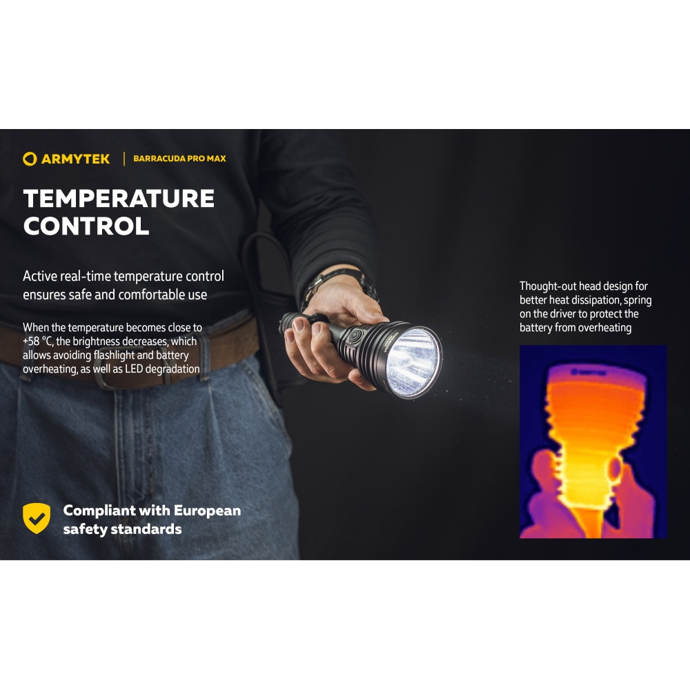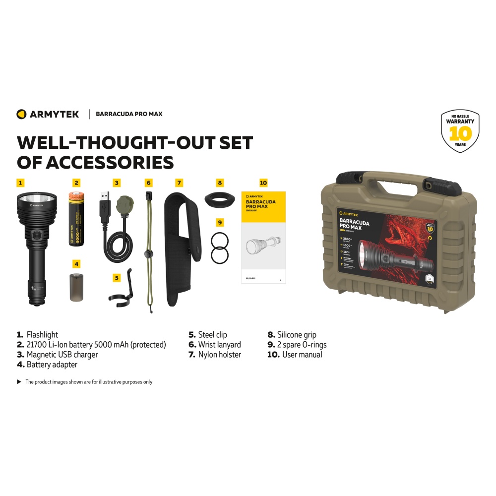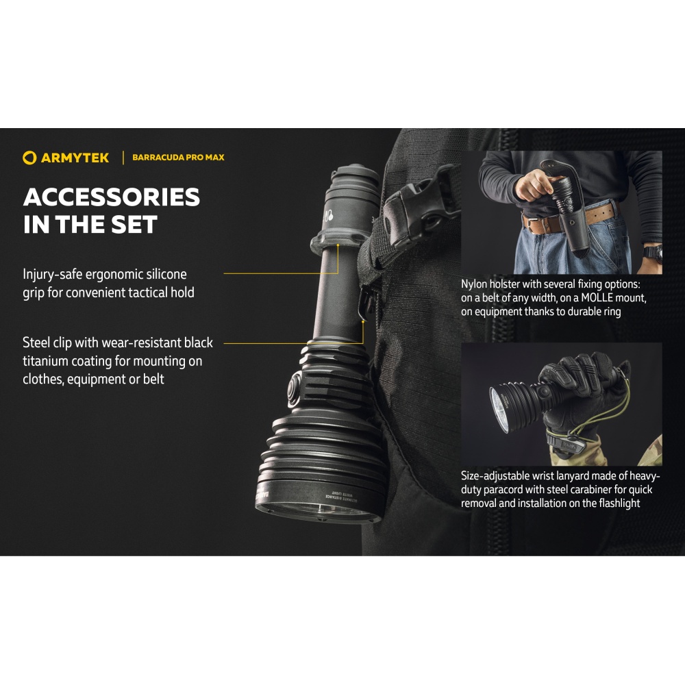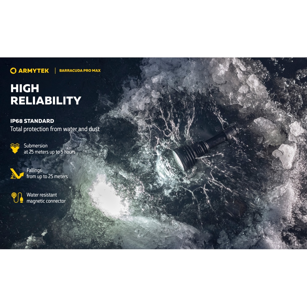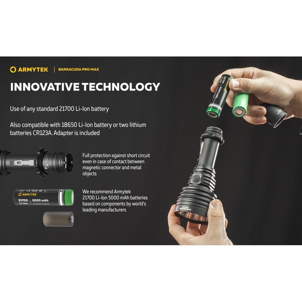 Armytek Barracuda Pro Max Magnet USB PCB on Armyteki uusima põlvkonna taktikalise suunitlusega otsingulamp. Esmakordselt Armyteki ajaloos on Barracuda otsingulamp saanud lisaks tagumisele taktikalisele lülitile ka külglüliti, mis muudab lambiga opereerimise tavakasutajatele mugavamaks ning kiiremaks. Barracuda on tugevakonstruktsiooniline, kompaktne ning eeskujuliku jõudlusega. Valgusjoonis on otsingulambile iseloomuliku tugevalt kontsentreeritud keskosaga (4 kraadi) ja vähemvalgustatud äärealadega (55 kraadi) maksimeerimiseks lambi suutlikkust just tööks keskmistel ja kaugetel distantsidel. Kontsentreeritud valguspunkti diameeter 100 meetri kaugusel on 7 meetrit. Maksimaalseks valgusvõimsuseks on 2800 luumenit ning maksimaalseks valgusvoo ulatuseks koguni 1000 meetrit (1km). Tänu suure mahutavusega akule ja kvaliteetsele toitesüsteemile ulatub Barracuda tööaeg ühe laadimisega minimaalsel 5 luumenilisel valgusvõimsusel kümne järjestikuse ööpäevani (240h). Valgustugevus on täielikult stabiliseeritud ja konstantse tugevusega igal töörežiimil. Kasutajaliides on lihtne ning saadaval on neli erinevat valgustugevust ning peidetud stroborežiim. Barracuda on üleni metallist korpusega vee- ja ilmastikukindel taskulamp pikkusega 188mm, pea diameetriga 64mm ja korpuse läbimõõduga 1" ehk 25,4mm. Barracuda Pro Max on testitud 25m sügavusel vees 5 tunni jooksul ning kukkumisele 25m kõrguselt. Toiteallikana kasutab lamp standardset vahetatavat tüüp 21700 Li-ion akut, kuid on võimeline töötama läbi komplekti kuuluva adapteri ka tüüp 18650 Li-ion akult ning kahelt CR123A liitiumpatareilt. Laadimiseks ei pea akut lambist eemaldama. Magnetkinnitusega laadimiskaabel kinnitub hetkega lambi tagaosa metallpindadega lüliti külge ning lamp on laetav läbi standardse USB väljundit omava toiteallika. Kiirlaadimisvõimekus võimaldab tühja 5000mAh aku täis laadida kõigest 2 tunni ja 45 minutiga. Lisaks omab Barracuda aku tühjenemise hoiatusfunktsiooni ja lambi automaatest ülekuumenemise eest kaitsevat süsteemi. Lisavarustusena on Barracuda kohanduv erinevate relvakinnitustega, jalgrattakinnitustega ja distantslülititega. Lambi standardsesse täiskomplekti kuulub lisaks valgustile Armyteki 5000mAh mahutavusega tüüp 21700 Li-ion aku, magnetlaadimiskaabel, käepael, vöövutlar, taktikaline rõngas, tagavara rõngastihendid, taskuklamber, väiksema toiteallika adapter, kasutusjuhend ning plastikust kandekohver.