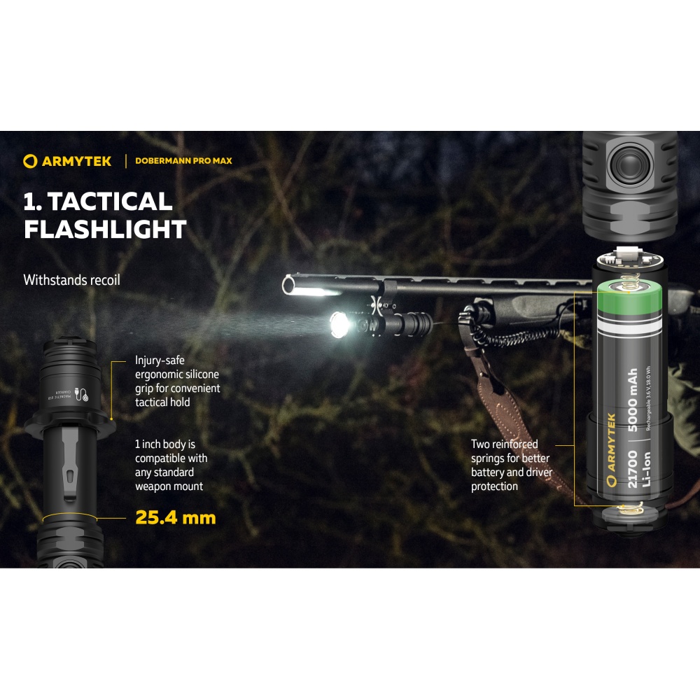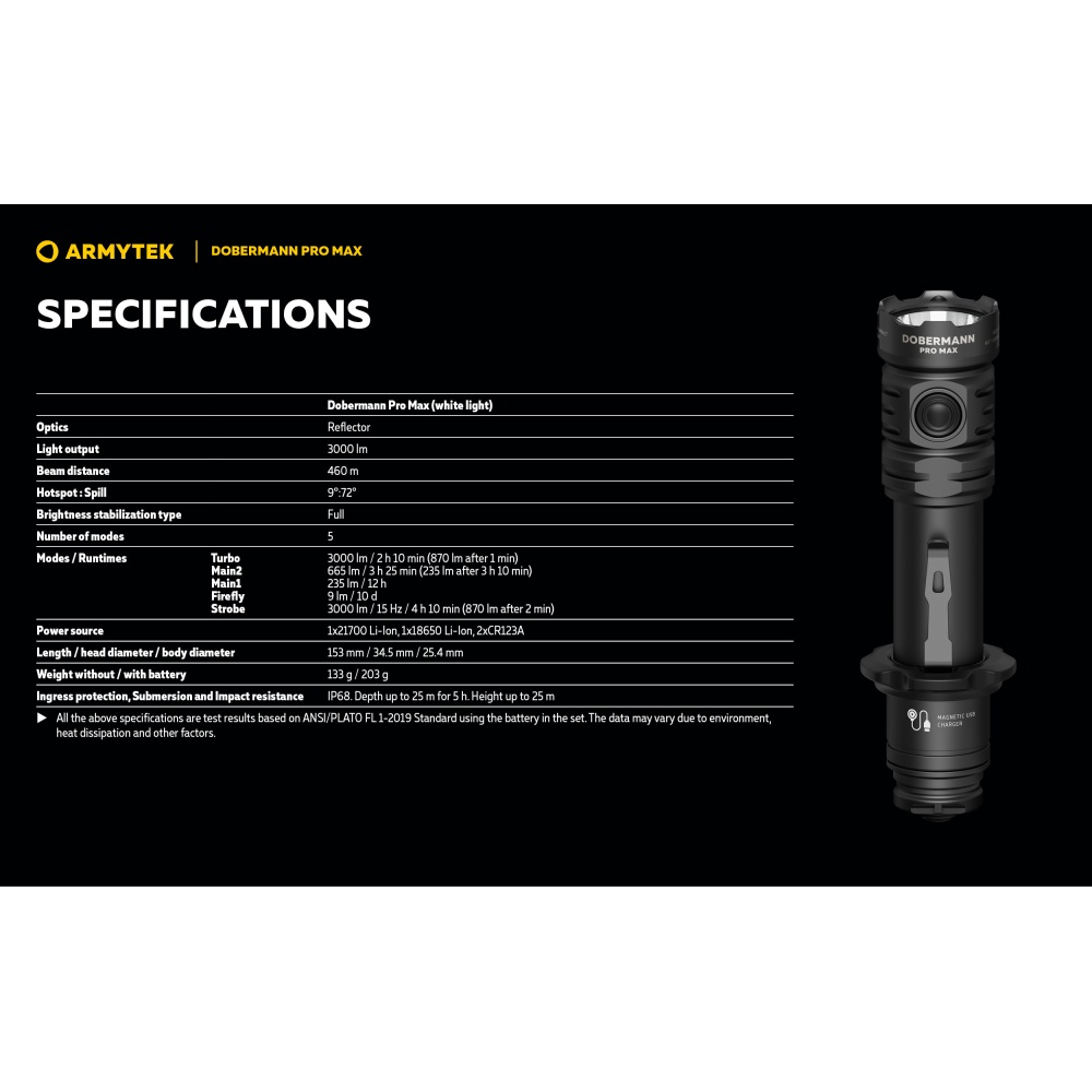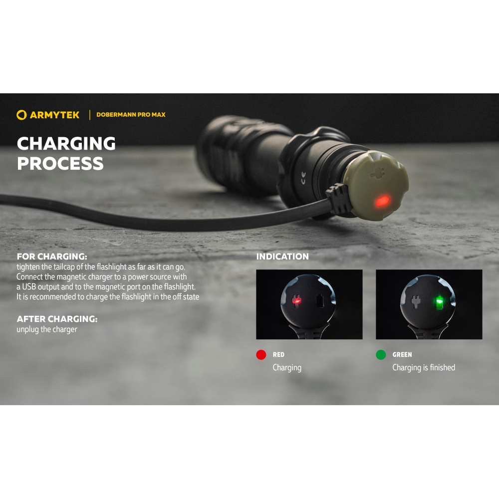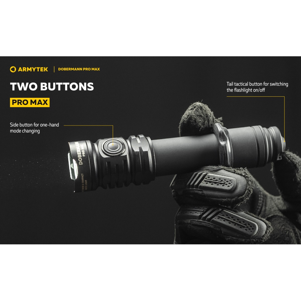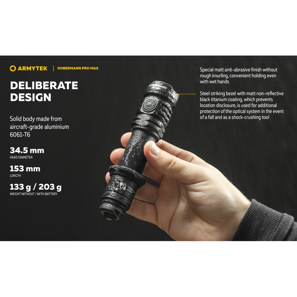 Armytek Dobermann Pro Max Magnet USB PCB on Armyteki uusima põlvkonna kompaktne taktikaline taskulamp. Esmakordselt Armyteki ajaloos on Dobermann saanud lisaks tagumisele taktikalisele lülitile ka külglüliti, mis muudab lambiga opereerimise tavakasutajatele mugavamaks ning kiiremaks. Dobermann on tugevakonstruktsiooniline, kompaktne ning eeskujuliku jõudlusega. Valgusjoonis on taktikalisele lambile iseloomuliku tugevalt kontsentreeritud keskosaga (9 kraadi) ja hästivalgustatud äärealadega (72 kraadi) maksimeerimiseks lambi suutlikkust just tööks keskmistel ja lähidistantsidel. Kontsentreeritud valguspunkti diameeter 100 meetri kaugusel on 15 meetrit. Maksimaalseks valgusvõimsuseks on 3000 luumenit ning maksimaalseks valgusvoo ulatuseks 460 meetrit. Tänu suure mahutavusega akule ja kvaliteetsele toitesüsteemile ulatub Dobermanni tööaeg ühe laadimisega minimaalsel 9 luumenilisel valgusvõimsusel kümne järjestikuse ööpäevani (240h). Valgustugevus on täielikult stabiliseeritud ja konstantse tugevusega igal töörežiimil. Kasutajaliides on lihtne ning saadaval on neli erinevat valgustugevust ja peidetud stroborežiim. Dobermann on üleni metallist korpusega vee- ja ilmastikukindel taskulamp pikkusega 153mm, pea diameetriga 34,5mm ja korpuse läbimõõduga 1" ehk 25,4mm. Dobermann Pro Max on testitud 25m sügavusel vees 5 tunni jooksul ning kukkumisele 25m kõrguselt. Toiteallikana kasutab lamp standardset vahetatavat tüüp 21700 Li-ion akut, kuid on võimeline töötama läbi komplekti kuuluva adapteri ka tüüp 18650 Li-ion akult ning kahelt CR123A liitiumpatareilt. Laadimiseks ei pea akut lambist eemaldama. Magnetkinnitusega laadimiskaabel kinnitub hetkega lambi tagaosa metallpindadega lüliti külge ning lamp on laetav läbi standardse USB väljundit omava toiteallika. Kiirlaadimisvõimekus võimaldab tühja 5000mAh aku täis laadida kõigest 2 tunni ja 45 minutiga. Lisaks omab Dobermann aku tühjenemise hoiatusfunktsiooni ja lambi automaatest ülekuumenemise eest kaitsevat süsteemi. Lisavarustusena on Dobermann kohanduv erinevate relvakinnitustega, jalgrattakinnitustega ja distantslülititega. Lambi standardsesse täiskomplekti kuulub lisaks valgustile Armyteki 5000mAh mahutavusega tüüp 21700 Li-ion aku, magnetlaadimiskaabel, käepael, vöövutlar, taktikaline rõngas, tagavara rõngastihendid, taskuklamber, väiksema toiteallika adapter, kasutusjuhend ning nägus plastikust hoiukarp.