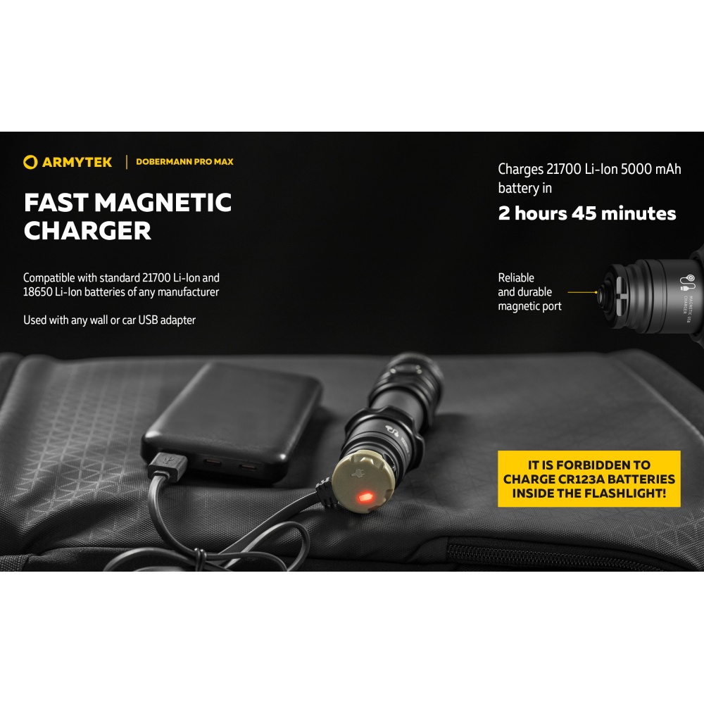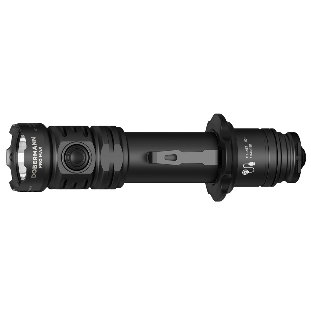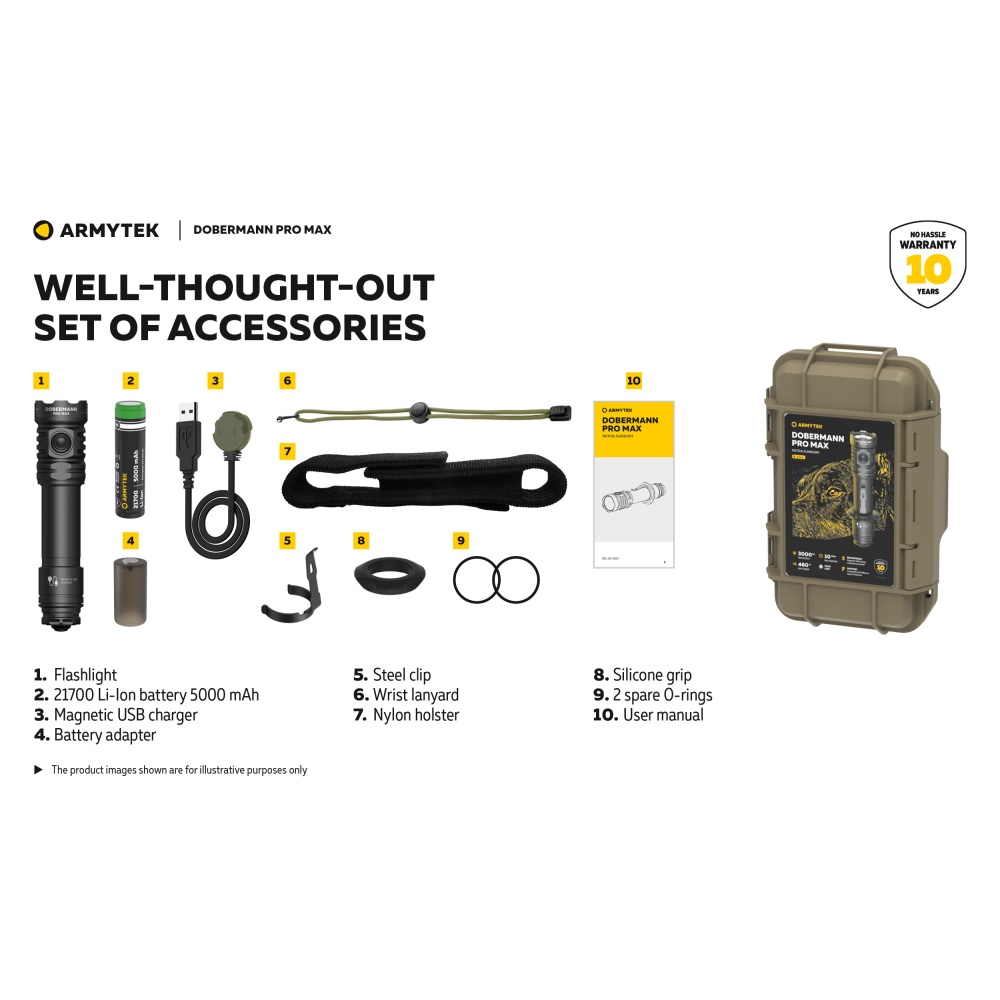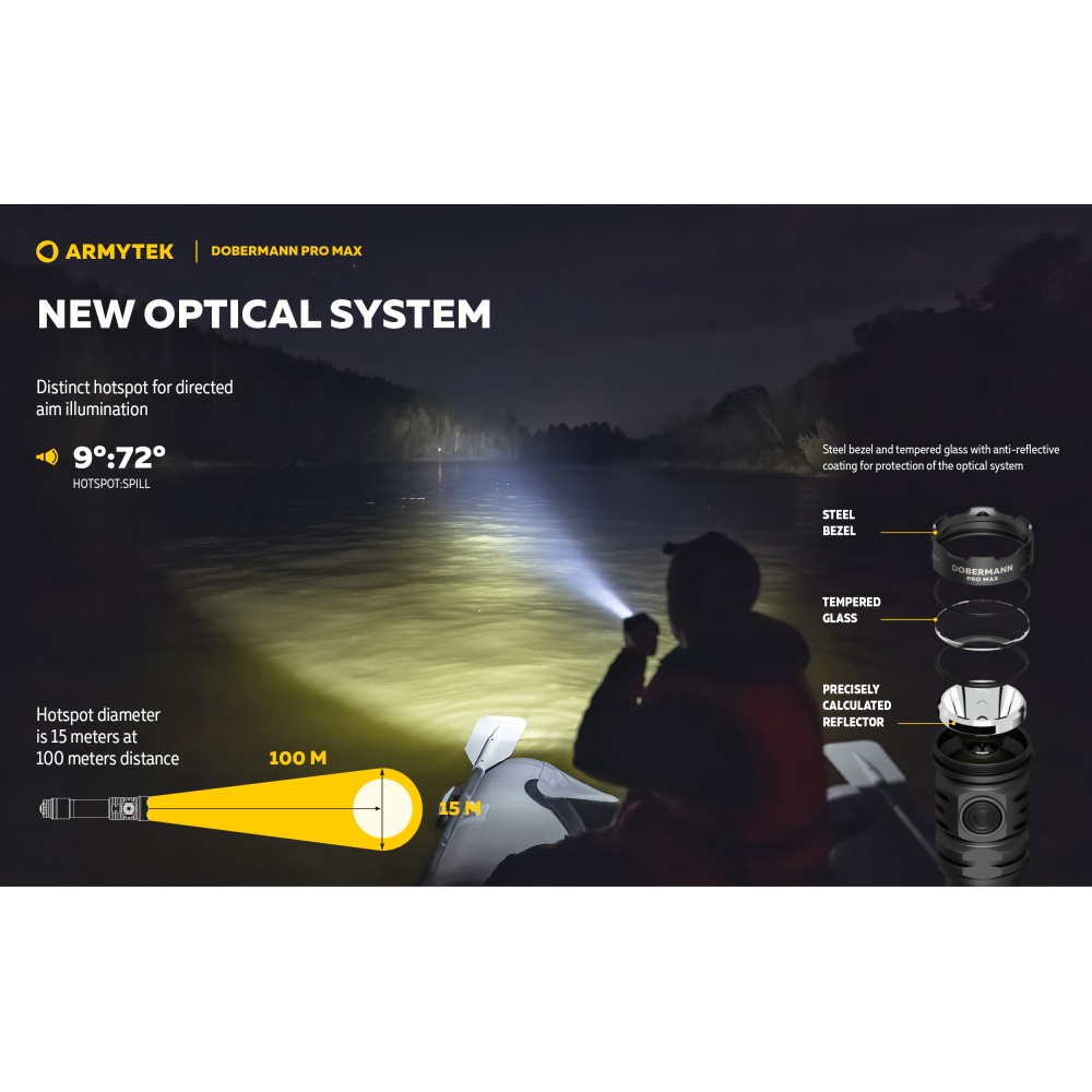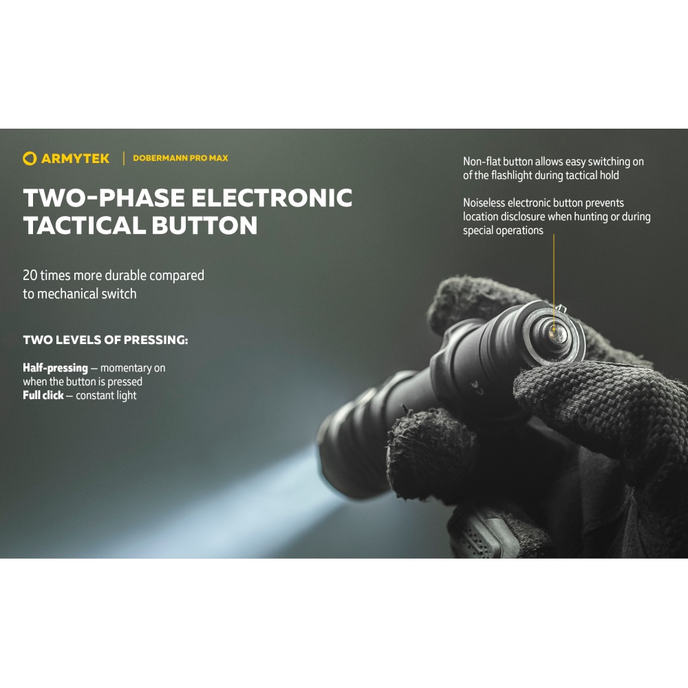 Armytek Dobermann Pro Max Magnet USB PCB on Armyteki uusima põlvkonna kompaktne taktikaline taskulamp. Esmakordselt Armyteki ajaloos on Dobermann saanud lisaks tagumisele taktikalisele lülitile ka külglüliti, mis muudab lambiga opereerimise tavakasutajatele mugavamaks ning kiiremaks. Dobermann on tugevakonstruktsiooniline, kompaktne ning eeskujuliku jõudlusega. Valgusjoonis on taktikalisele lambile iseloomuliku tugevalt kontsentreeritud keskosaga (9 kraadi) ja hästivalgustatud äärealadega (72 kraadi) maksimeerimiseks lambi suutlikkust just tööks keskmistel ja lähidistantsidel. Kontsentreeritud valguspunkti diameeter 100 meetri kaugusel on 15 meetrit. Maksimaalseks valgusvõimsuseks on 3000 luumenit ning maksimaalseks valgusvoo ulatuseks 460 meetrit. Tänu suure mahutavusega akule ja kvaliteetsele toitesüsteemile ulatub Dobermanni tööaeg ühe laadimisega minimaalsel 9 luumenilisel valgusvõimsusel kümne järjestikuse ööpäevani (240h). Valgustugevus on täielikult stabiliseeritud ja konstantse tugevusega igal töörežiimil. Kasutajaliides on lihtne ning saadaval on neli erinevat valgustugevust ja peidetud stroborežiim. Dobermann on üleni metallist korpusega vee- ja ilmastikukindel taskulamp pikkusega 153mm, pea diameetriga 34,5mm ja korpuse läbimõõduga 1" ehk 25,4mm. Dobermann Pro Max on testitud 25m sügavusel vees 5 tunni jooksul ning kukkumisele 25m kõrguselt. Toiteallikana kasutab lamp standardset vahetatavat tüüp 21700 Li-ion akut, kuid on võimeline töötama läbi komplekti kuuluva adapteri ka tüüp 18650 Li-ion akult ning kahelt CR123A liitiumpatareilt. Laadimiseks ei pea akut lambist eemaldama. Magnetkinnitusega laadimiskaabel kinnitub hetkega lambi tagaosa metallpindadega lüliti külge ning lamp on laetav läbi standardse USB väljundit omava toiteallika. Kiirlaadimisvõimekus võimaldab tühja 5000mAh aku täis laadida kõigest 2 tunni ja 45 minutiga. Lisaks omab Dobermann aku tühjenemise hoiatusfunktsiooni ja lambi automaatest ülekuumenemise eest kaitsevat süsteemi. Lisavarustusena on Dobermann kohanduv erinevate relvakinnitustega, jalgrattakinnitustega ja distantslülititega. Lambi standardsesse täiskomplekti kuulub lisaks valgustile Armyteki 5000mAh mahutavusega tüüp 21700 Li-ion aku, magnetlaadimiskaabel, käepael, vöövutlar, taktikaline rõngas, tagavara rõngastihendid, taskuklamber, väiksema toiteallika adapter, kasutusjuhend ning nägus plastikust hoiukarp.