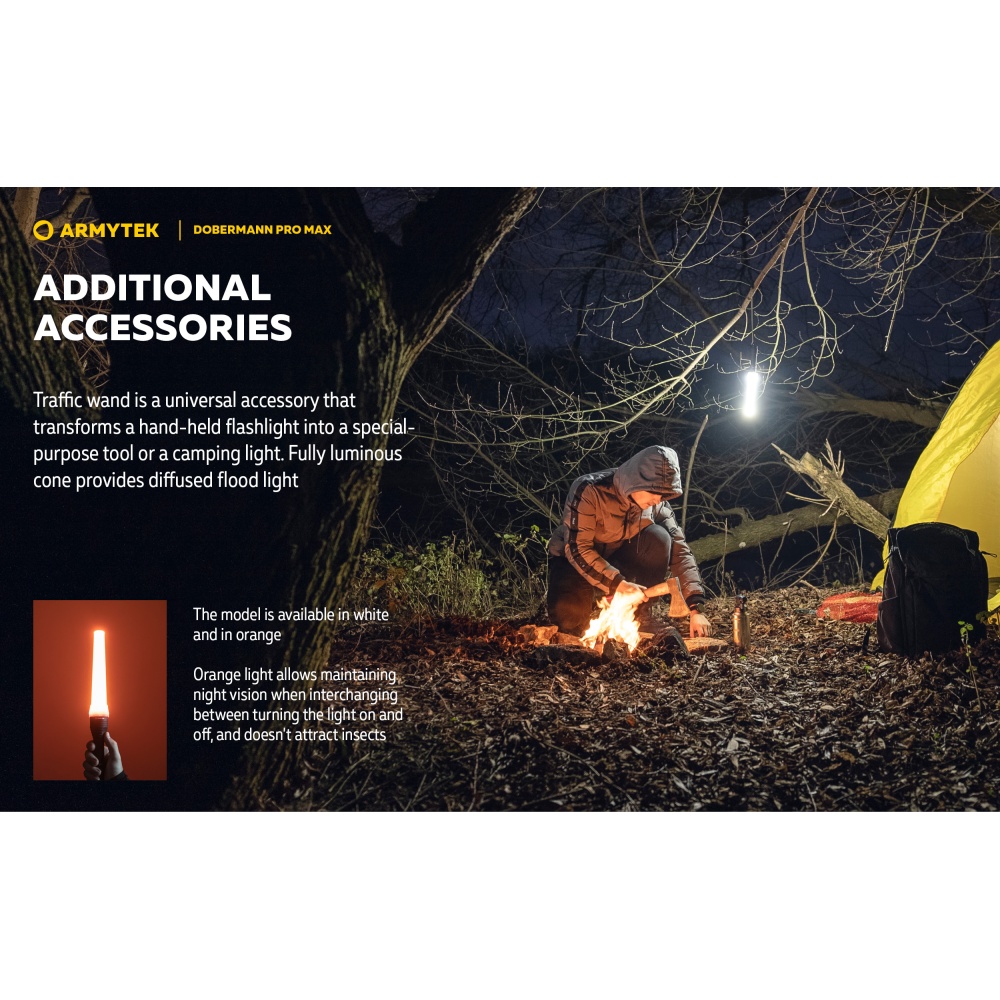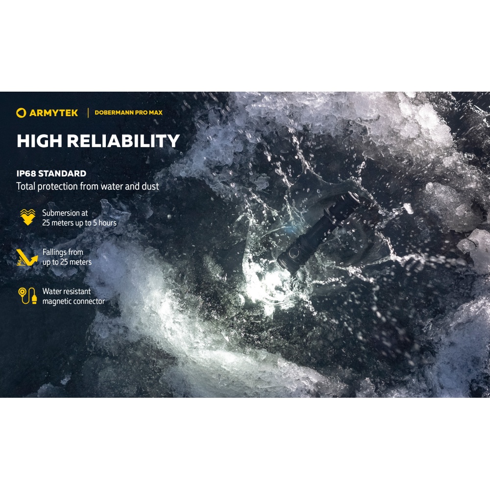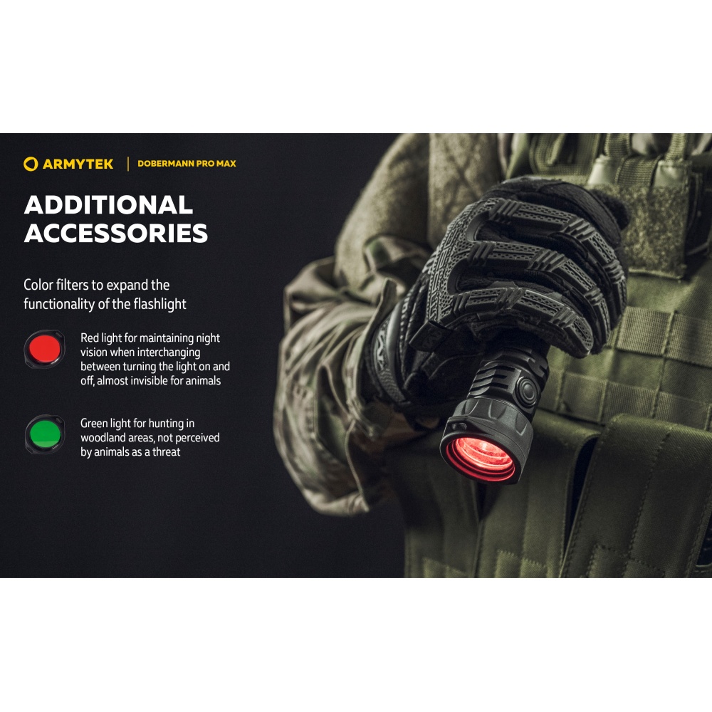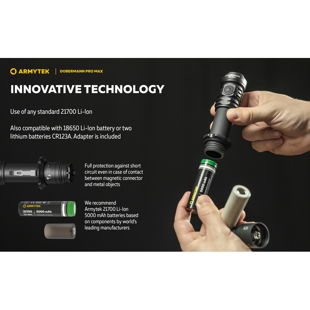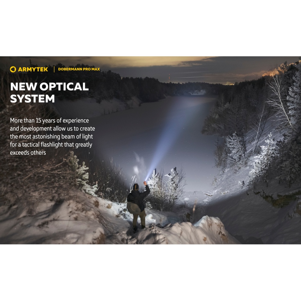 Armytek Dobermann Pro Max Magnet USB PCB on Armyteki uusima põlvkonna kompaktne taktikaline taskulamp. Esmakordselt Armyteki ajaloos on Dobermann saanud lisaks tagumisele taktikalisele lülitile ka külglüliti, mis muudab lambiga opereerimise tavakasutajatele mugavamaks ning kiiremaks. Dobermann on tugevakonstruktsiooniline, kompaktne ning eeskujuliku jõudlusega. Valgusjoonis on taktikalisele lambile iseloomuliku tugevalt kontsentreeritud keskosaga (9 kraadi) ja hästivalgustatud äärealadega (72 kraadi) maksimeerimiseks lambi suutlikkust just tööks keskmistel ja lähidistantsidel. Kontsentreeritud valguspunkti diameeter 100 meetri kaugusel on 15 meetrit. Maksimaalseks valgusvõimsuseks on 3000 luumenit ning maksimaalseks valgusvoo ulatuseks 460 meetrit. Tänu suure mahutavusega akule ja kvaliteetsele toitesüsteemile ulatub Dobermanni tööaeg ühe laadimisega minimaalsel 9 luumenilisel valgusvõimsusel kümne järjestikuse ööpäevani (240h). Valgustugevus on täielikult stabiliseeritud ja konstantse tugevusega igal töörežiimil. Kasutajaliides on lihtne ning saadaval on neli erinevat valgustugevust ja peidetud stroborežiim. Dobermann on üleni metallist korpusega vee- ja ilmastikukindel taskulamp pikkusega 153mm, pea diameetriga 34,5mm ja korpuse läbimõõduga 1" ehk 25,4mm. Dobermann Pro Max on testitud 25m sügavusel vees 5 tunni jooksul ning kukkumisele 25m kõrguselt. Toiteallikana kasutab lamp standardset vahetatavat tüüp 21700 Li-ion akut, kuid on võimeline töötama läbi komplekti kuuluva adapteri ka tüüp 18650 Li-ion akult ning kahelt CR123A liitiumpatareilt. Laadimiseks ei pea akut lambist eemaldama. Magnetkinnitusega laadimiskaabel kinnitub hetkega lambi tagaosa metallpindadega lüliti külge ning lamp on laetav läbi standardse USB väljundit omava toiteallika. Kiirlaadimisvõimekus võimaldab tühja 5000mAh aku täis laadida kõigest 2 tunni ja 45 minutiga. Lisaks omab Dobermann aku tühjenemise hoiatusfunktsiooni ja lambi automaatest ülekuumenemise eest kaitsevat süsteemi. Lisavarustusena on Dobermann kohanduv erinevate relvakinnitustega, jalgrattakinnitustega ja distantslülititega. Lambi standardsesse täiskomplekti kuulub lisaks valgustile Armyteki 5000mAh mahutavusega tüüp 21700 Li-ion aku, magnetlaadimiskaabel, käepael, vöövutlar, taktikaline rõngas, tagavara rõngastihendid, taskuklamber, väiksema toiteallika adapter, kasutusjuhend ning nägus plastikust hoiukarp.