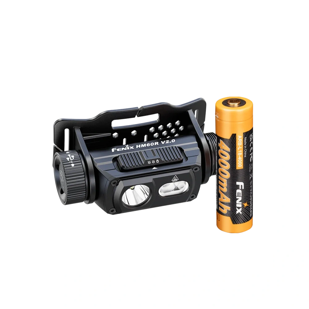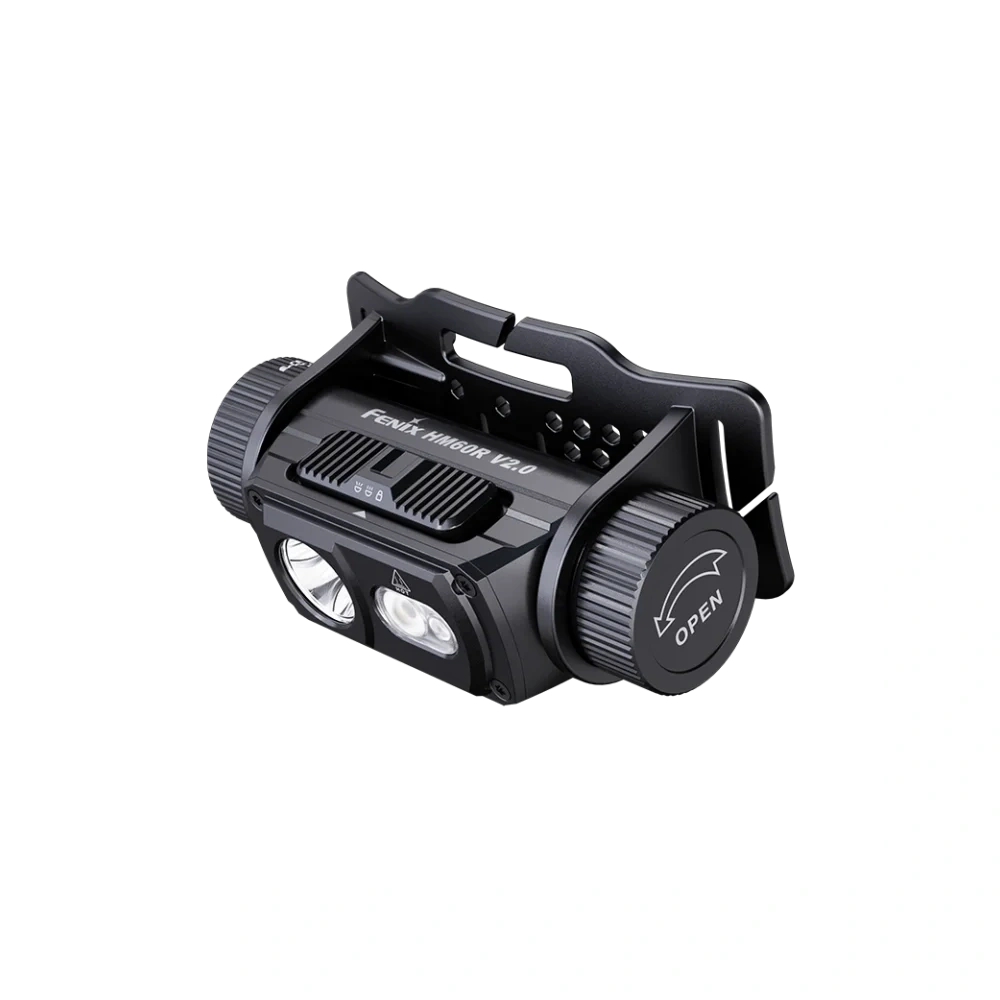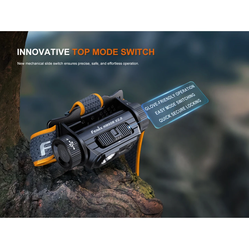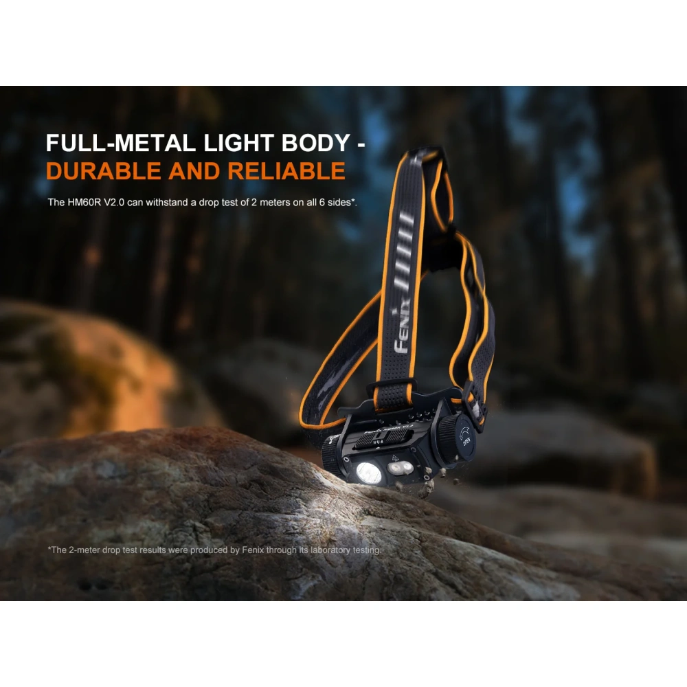 Fenix HM60R V2.0 on Fenix'i bestselleri HM60R edasiarendus. Kasutajaliidest on muudetud veelgi kasutajasõbralikumaks, suurenenud on valgusjõud koos maksimaalse valgusvoo ulatusega, lisandunud on täiendav punase valguse valgustugevus ning nüüdsest on lambiga kaasas maksimaalse võimaliku mahutavusega (4000mAh) vahetatav tüüp 18650 li-ion aku. Lisaks on USB-C otselaadimisport saanud täielikult veekindla ehituse. Ehk kui metallist tugev laadimispesa kate peakski lahti ununema, ei pääse niiskus ega vesi lampi sisse. Suurima uuendusena on lambi peal nüüd suur ja ka kinnastega opereeritav liugur-tüüpi toitelüliti, mis võimaldab sisse lülitada kas hajusa või punktvalguse režiimi. Valgustugevuste valimine käib lambi küljel asuvast eraldi külglülitist.