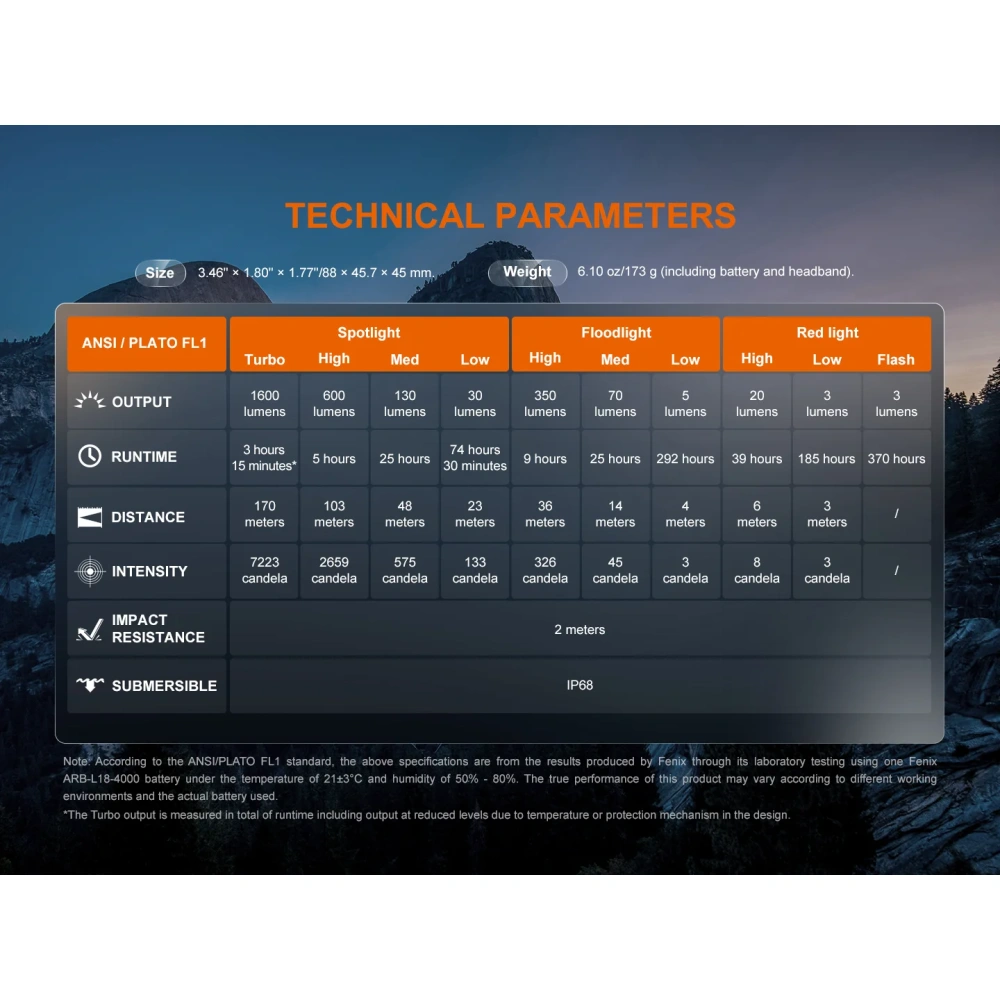 | Tööaeg maksimaalsel režiimil (ANSI FL1) | Põhivalgus 3h15min@1600lm (sis.stepdown); hajus valgus 9h@350lm (sis.stepdown); punane valgus 39h@20lm |