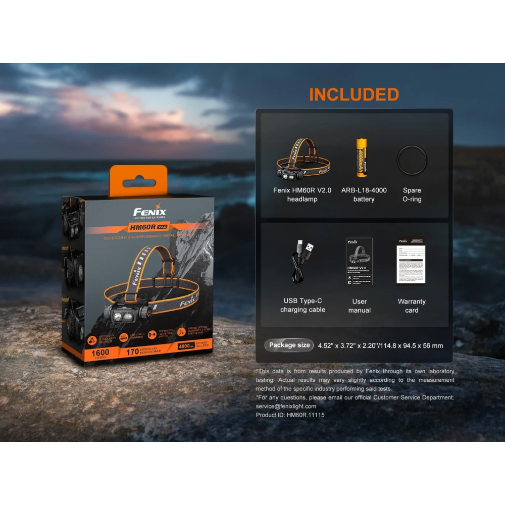 Fenix HM60R V2.0 on kompaktne pealamp, mis on tänu suure mahutavusega vahetatavale akule ette nähtud pakkuma oma suurust arvestades väga pikkasid tööaegasid laadimiste vahel. Arusaadavalt on HM60R V2.0-l eraldi optika nii kaugete objektide valgustamiseks kui ka lähitöö tegemiseks. Esimene neist on puhta valge valgusega ning teine neutraalse valge valgusega, mis parandab värviülekannet ja vähendab silmade väsimust tehisvalguse tingimustes. Lisaks on lambil punase valguse LED element. Akut ei pea laadimiseks lambist eemaldama. Laadimine toimub läbi lampi integreeritud ning metallkattega kaitstud USB-C laadimispordi standardse USB-C kaabli abil. HM60R V2.0 on täielikult vee- ja ilmastikukindel, omades maksimaalset kaitseklassi IP68. Lisaks on lambil testitud põrutuskindlus kukkumisele kõrguselt kuni 2 meetrit. Fenix HM60R V2.0 maksimaalseks valgusjõuks on 1600 luumenit ja maksimaalseks valgusvoo ulatuseks 170 meetrit. Kokku on pealambil seitse erinevat valge valguse režiimi (punktvalguse puhul neli, hajusa valguse puhul kolm), kaks punase valguse valgustugevust ning punase valguse vilkuv funktsioon.