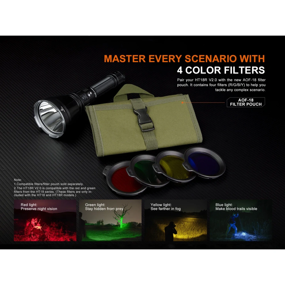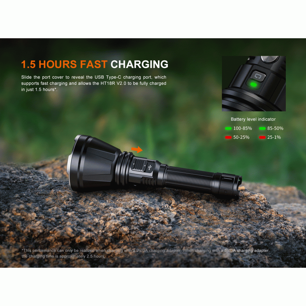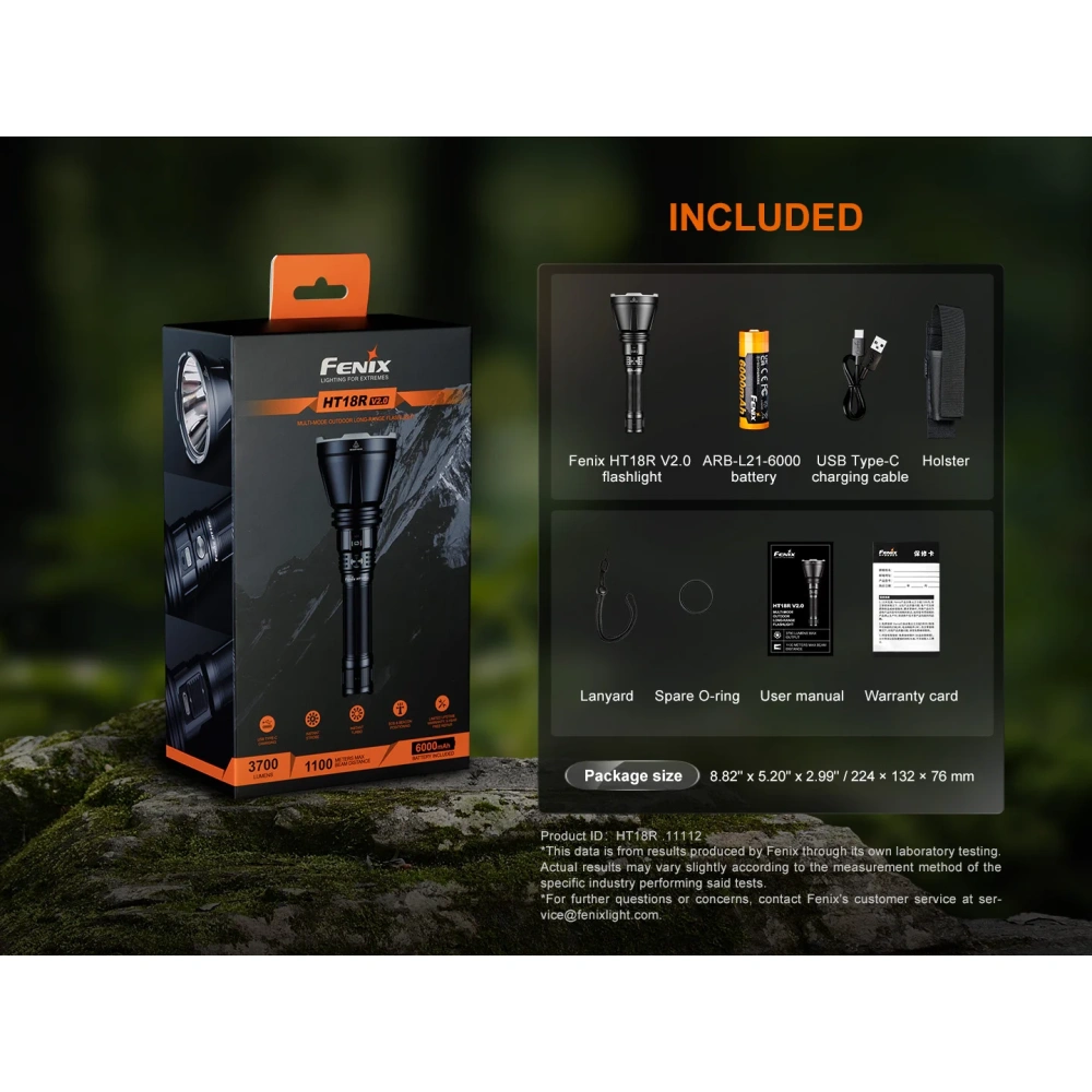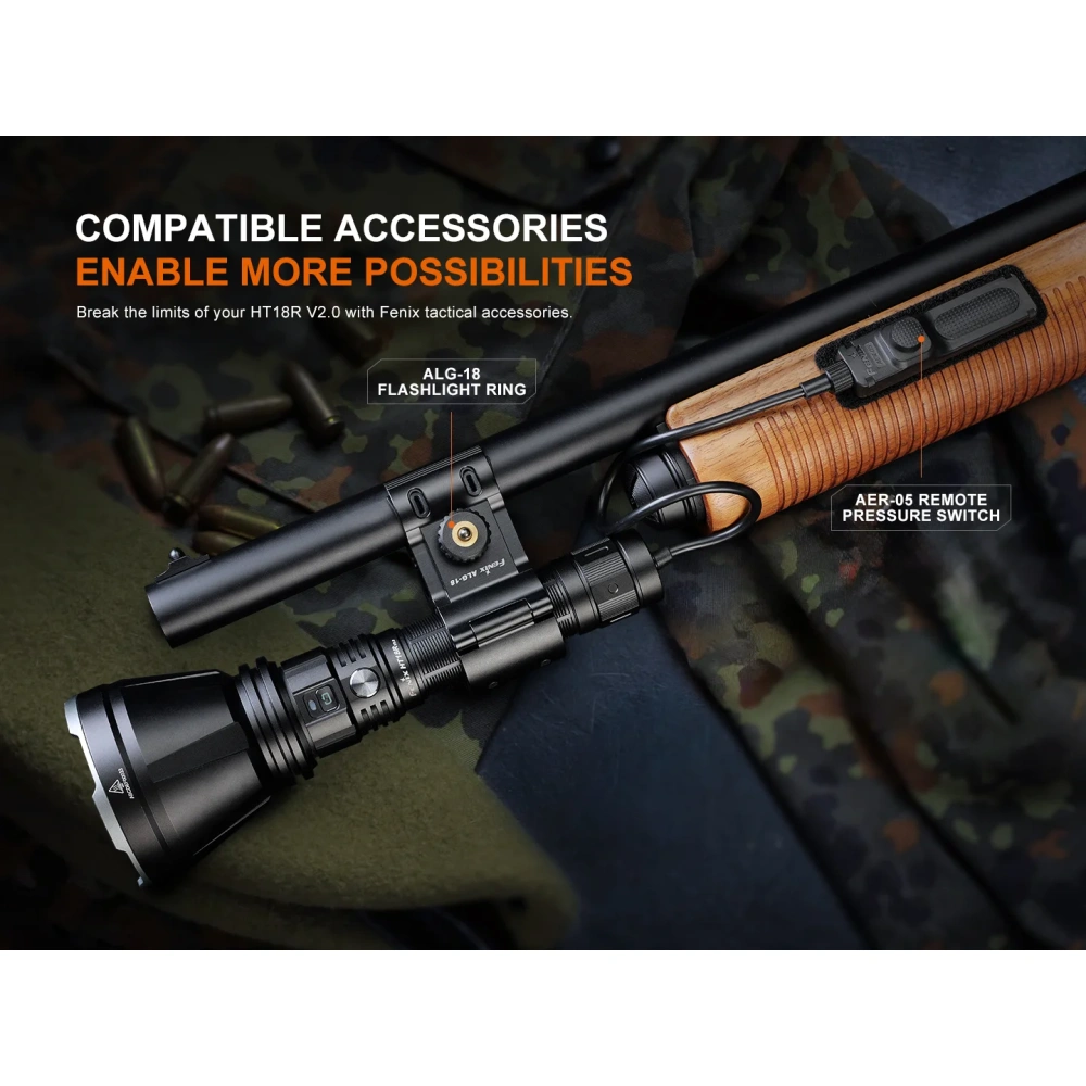 Fenix HT18R V2.0 on kompaktne otselaetav otsingulamp professionaalseks kasutamiseks. Sobiv eelkõige jahimeestele, päästeteenistustele ja turvatöötajatele. Tegemist on oma suuruse kohta muljetavaldava võimekusega taskulambiga. Fenix HT18R V2.0 maksimaalseks valgusjõuks on 3700 luumenit ning valgusvoo ulatuseks kuni 1100 meetrit (1,1km). Lambil on kokku neli valgustugevust (3700lm, 1000lm, 350lm, 30lm) ja kolm peidetud erirežiimi (strobo, sos, majakas). Fenix HT18R V2.0 omab maksimaalset kaitseklassi IP68, on testitud veekindlusega kuni 2m ning testitud põrutuskindlusega kuni 1m. Lambiga opereerimiseks on korpuse küljel esiosas kaks lülitit - üks lambi töösse lülitamiseks ja teine töörežiimide ning valgustugevuse vahetamiseks. Fenix HT18R V2.0 on valmistatud tugevast alumiiniumist korpusega, mis on kaetud tüüp III anodeeringuga. Reflektori katteklaas on karastatud ning kaetud peegeldusvastase vääristusega. Toiteallikana kasutab HT18R vahetatavat suure mahutavusega (6000mAh) uue generatsiooni tüüp 21700 Li-ion akut, mis on otselaetav läbi lambi USB-C laadimispordi. USB-C otselaadimisport on sisemise veekindlusega konstruktsiooninga ning ei lase veel lampi sattuda isegi siis, kui laadimispordi mehaaniline kate on lahti ununenud. HT18R V2.0 on varustatud nii ülekuumenemiskaitsega, aku laetustaseme indikatsiooniga, aku tühjenemise hoiatusindikatsiooniga kui ka laadimisindikatsiooniga. Lisaks on akusalv relva tagasilööki leevendava kahepoolse vedrumehhanismiga.