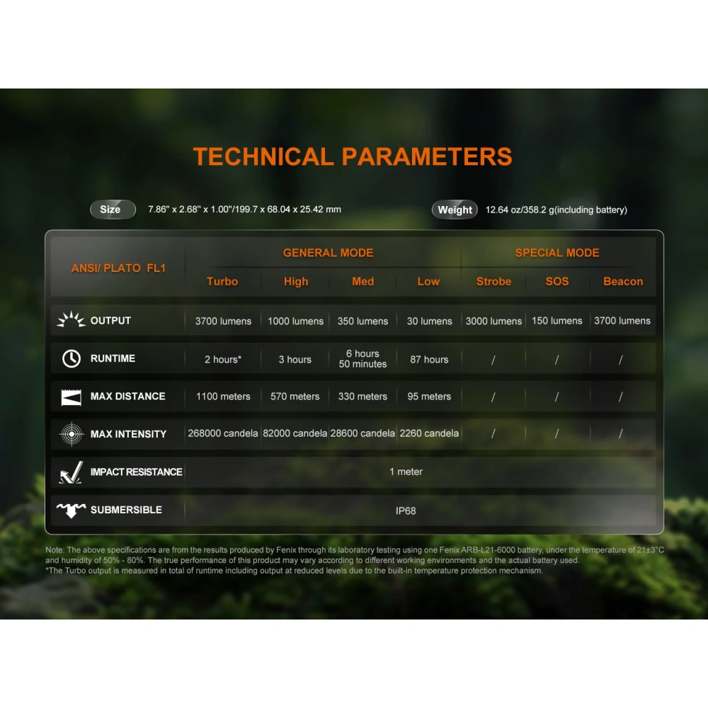 | Primaarse toiteallika tüüp | Terava "+" kontakti ja PCB kaitsega suure koormustaluvusega tüüp 21700 Li-ion aku (soovit. Fenix'i kvaliteetakud) |