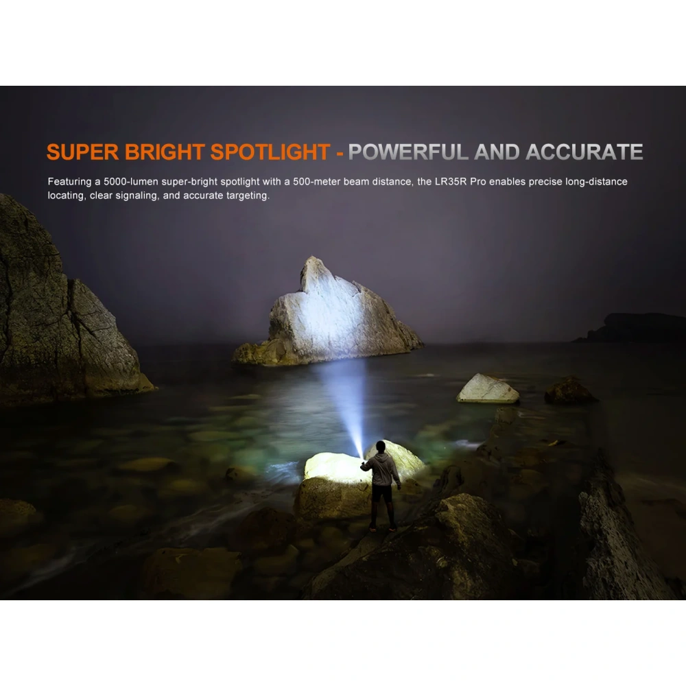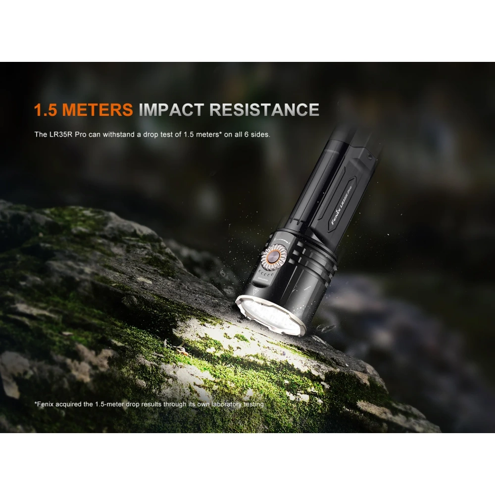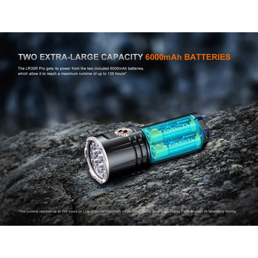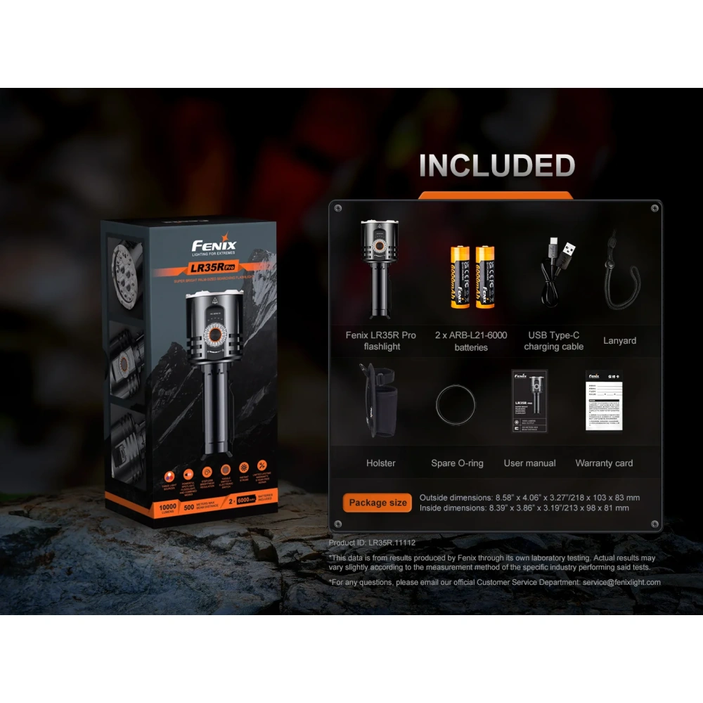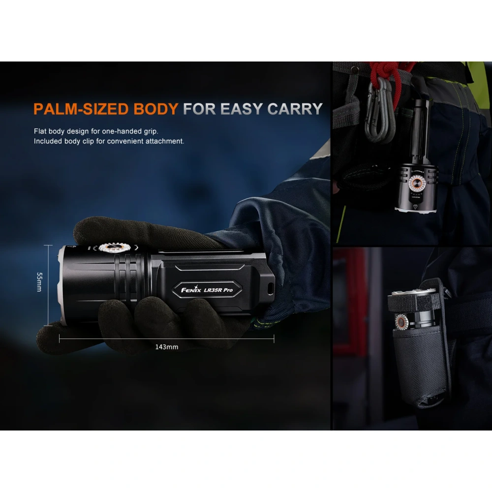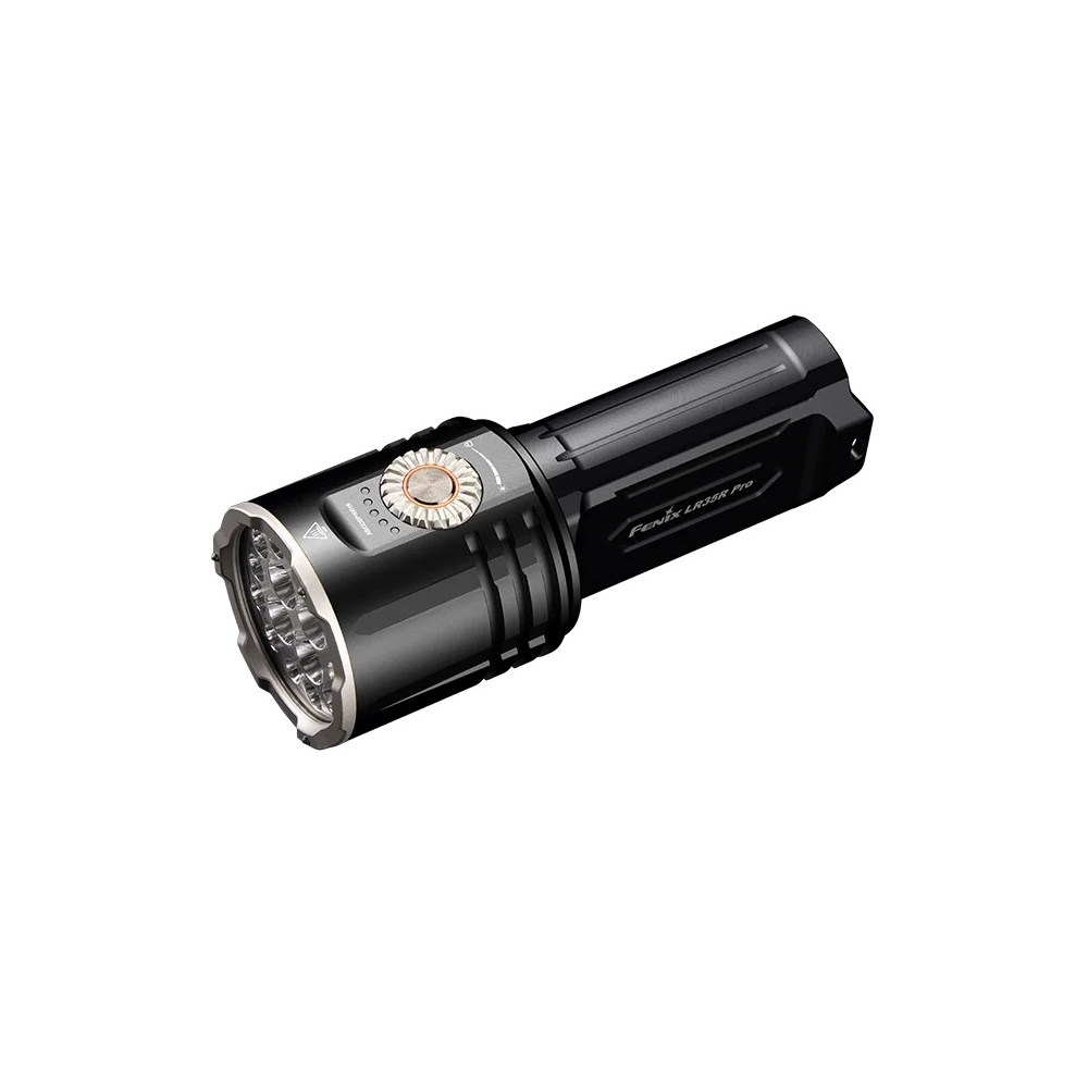 Fenix LR35R Pro on 10000 luumenilise maksimaalse valgustugevusega universaalne taskulamp. Tegemist on võrdlemisi kompaktse taskulambiga, mis mahub muretult ka jope taskusse. Fenix LR35R on kõigest 14,3cm pikk ning 5,5cm maksimaalse läbimõõduga lambi kõige paksemas osas. Lamp peidab endas koguni 15 LED elementi. Neist neli on Luminus SFT25 elemendid kuni 5000lm punktvalgusele, kaheksa Luminus SST25 8000lm hajusale valgusele, kaks Osram GR 260lm punasele valgusele ning üks Luminus SST-10-UV element 3,7W 365nm UV valgusele. Maksimaalne valgustugevus 10000lm saavutatakse punkt- ja hajusa valguse LED elementide samaaegsel töösse lülitamisel maksimaalsel valgustugevusel. Nii punktvalguse, hajusa valguse, kombineeritud valguse kui punase valgese režiimis on saadaval kolm erinevat valgustugevust, punases vilkuvas režiimis kaks, UV valguse režiimis üks ning valge valguse erirežiimid strobo ja SOS. Lisaks on võimalik kõikides valgusrežiimides (v.a vilkuvad režiimid) valgustugevust muuta mitte astmeliselt vaid dimmerdatuna. Selleks on lambi peal pööratav lüliti. Oma valgusjooniselt on LR35R Pro kergema otsingulambi võimekusega universaallamp. Maksimaalseks valgusvoo ulatuseks on kuni 500m. Seega on LR35R Pro sobilik valgustama keskmiselt kaugemaid objekte või korraga väga laiasid alasid.