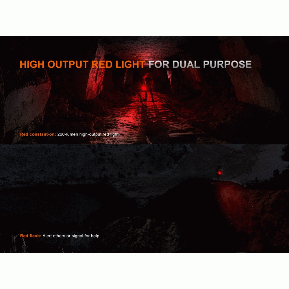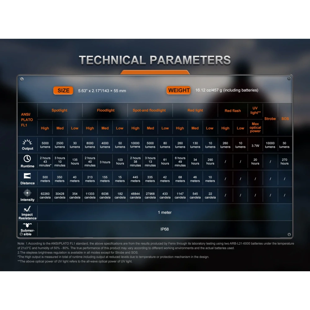 | Töörežiimid (ANSI FL1) | Punktvalgus 5000lm, 2500lm, 30lm. Hajus valgus 8000lm, 4000lm, 50lm. Kombineeritud 10000lm, 5000lm, 80lm. Punane 260lm, 130lm, 10lm, vlikuv 260lm, vlikuv 10lm. 3,7W UV, 10000lm strobo, 30lm SOS |