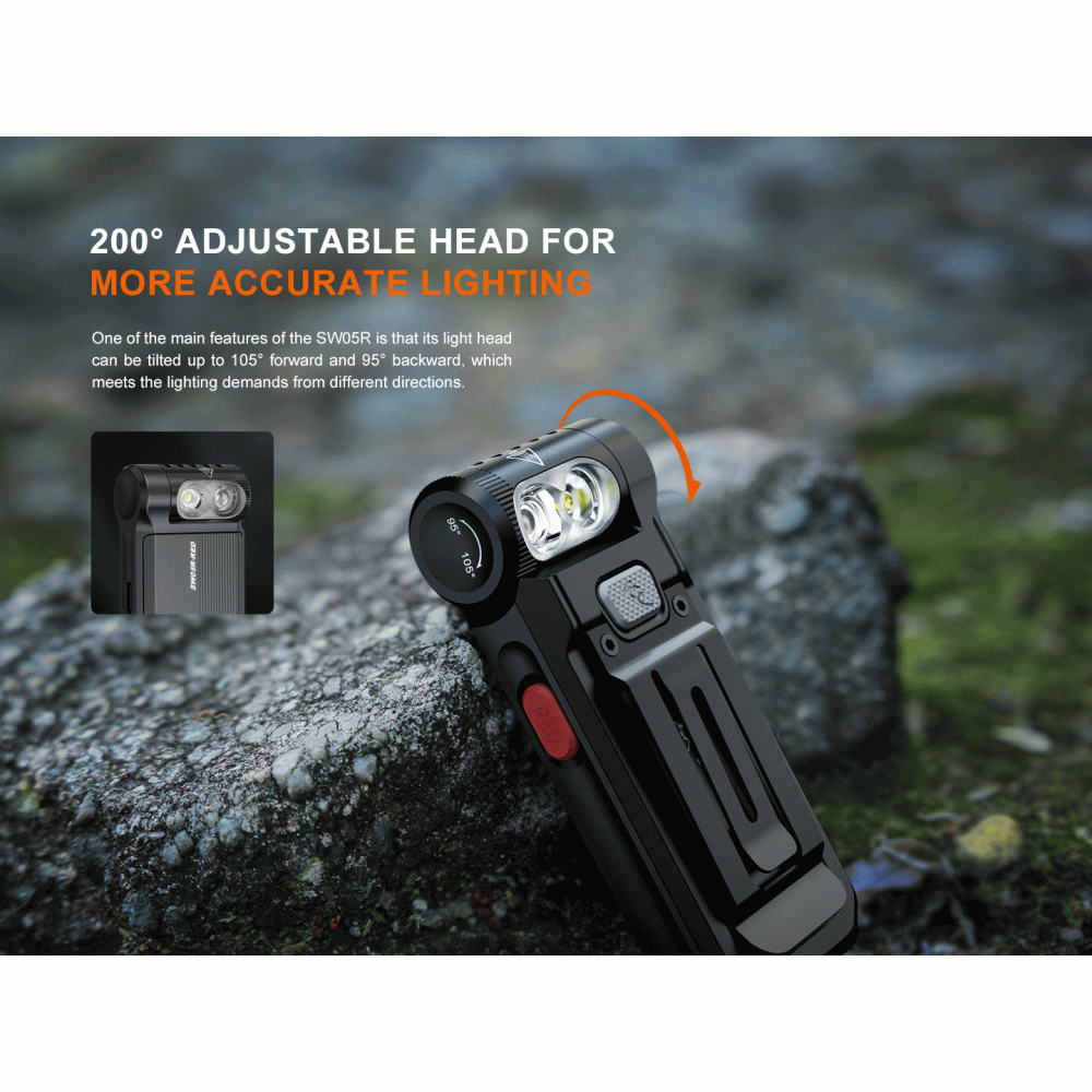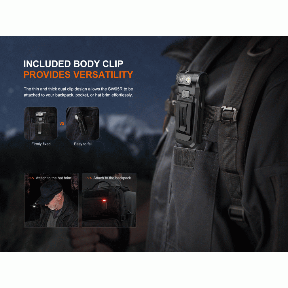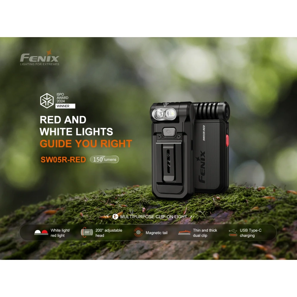 Fenix SW05R on kompaktne (81mm x 35mm x 18mm) otselaetav klambriga rinnataskule, riietusele või rakmetele kinnitatav taskulamp. Peamiselt ette nähtud käed-vabad töövalgustiks korrakaitsesektorisse (dokumentide kontroll või täitmine pimedas), kuid sobib hästi ka universaalvalgustiks matkale ja reisile. SW05R valguspea on pööratav 200 kraadi ulatuses, täpsemalt 105 kraadi ettepoole ja 95 kraadi tagasi. Lisaks on lambi tagaossa paigaldatud kinnitusmagnet, mille abil saab valgusti paigaldada ferromagneetilistele pindadele. Kinnitusklamber on lai, tugev ning mõnusalt madala profiiliga. Lambi laadimine toimub läbi integreeritud USB-C laadimispordi.