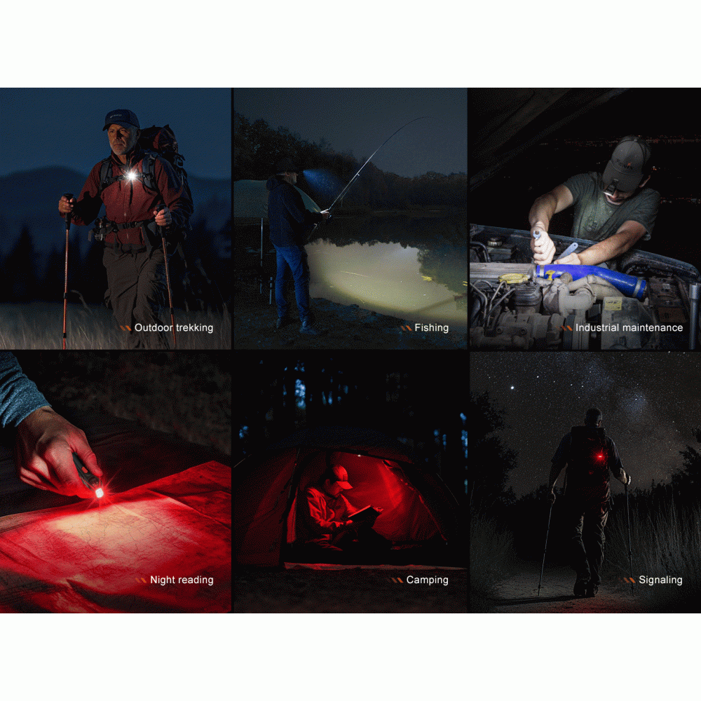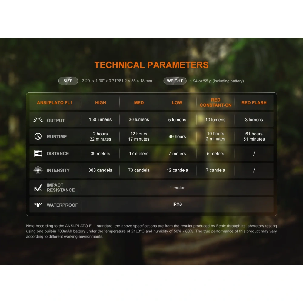 | Töörežiimid (ANSI FL1) | max.150lm@2h32min, max.30lm@12h17min, 5lm@49h, punane 10lm@10h2min, punane 3lm vilkuv@61h51min |