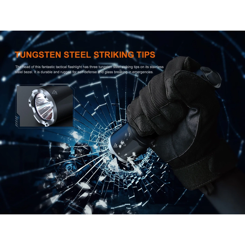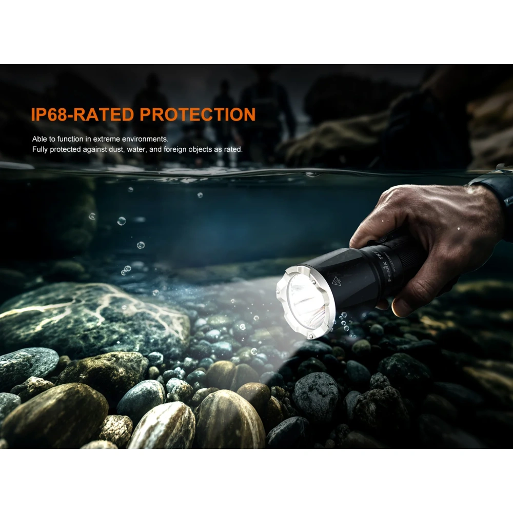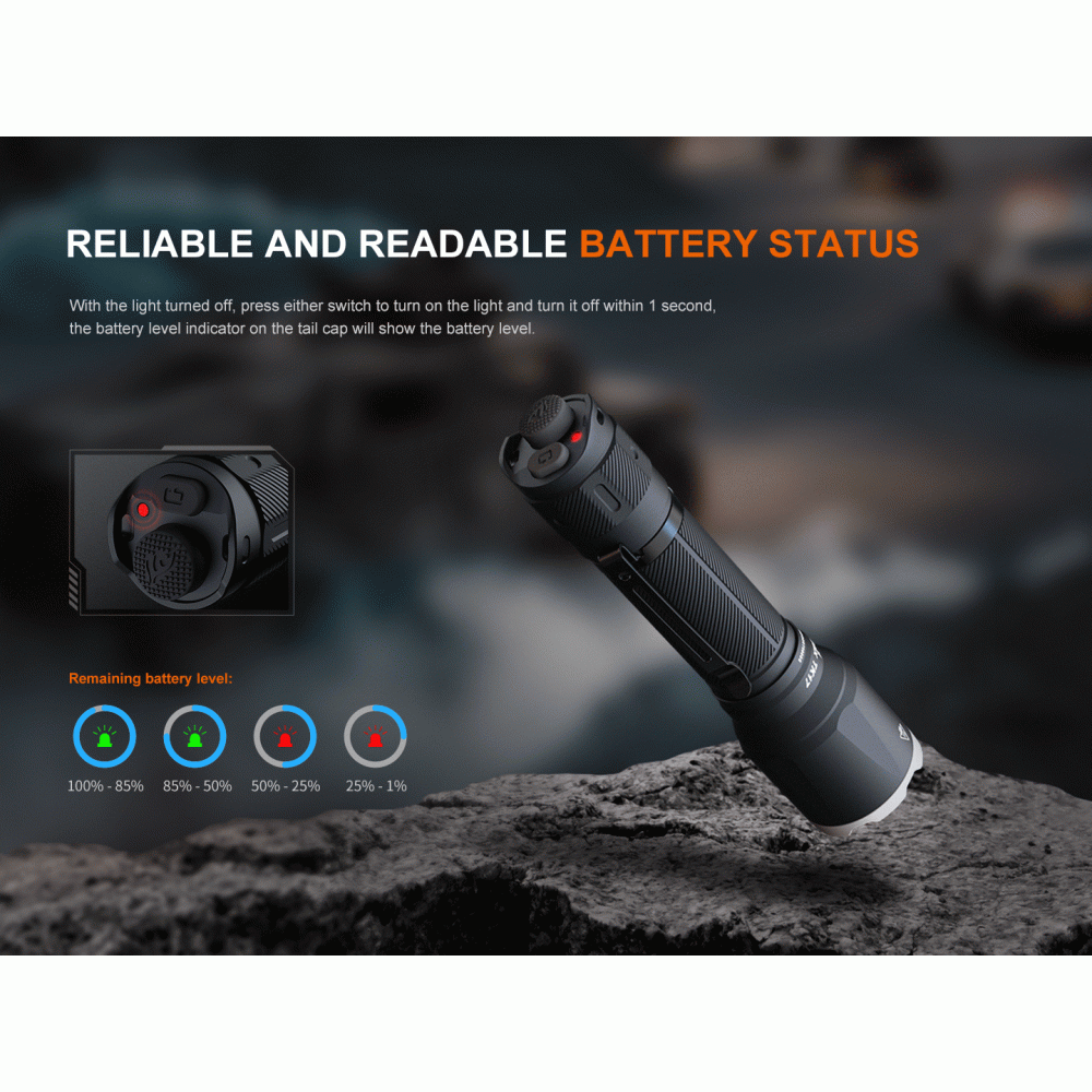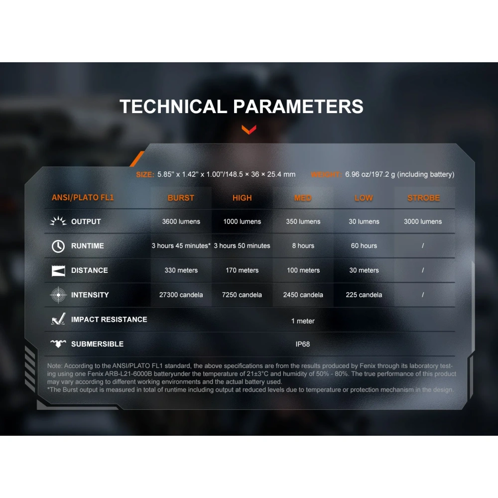 | Komplekti kuulub | Lamp, 6000mAh mahutavusega tüüp 21700 li-ion aku, laadimiskaabel, käepael, kerge vöövutlar, tagavara rõngastihend, kasutusjuhend, Fenix AER-05 distantslüliti ja FM2 universaalne magnetkinnitusega relvakinnitusklamber |