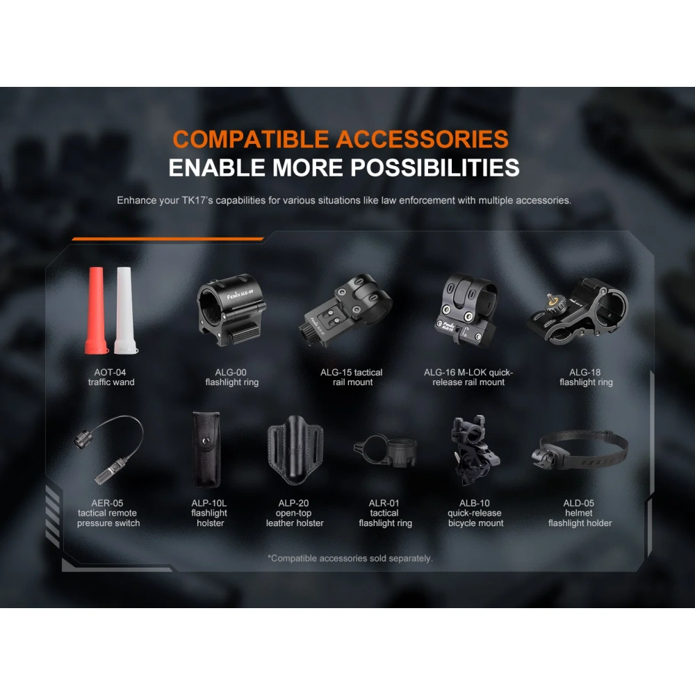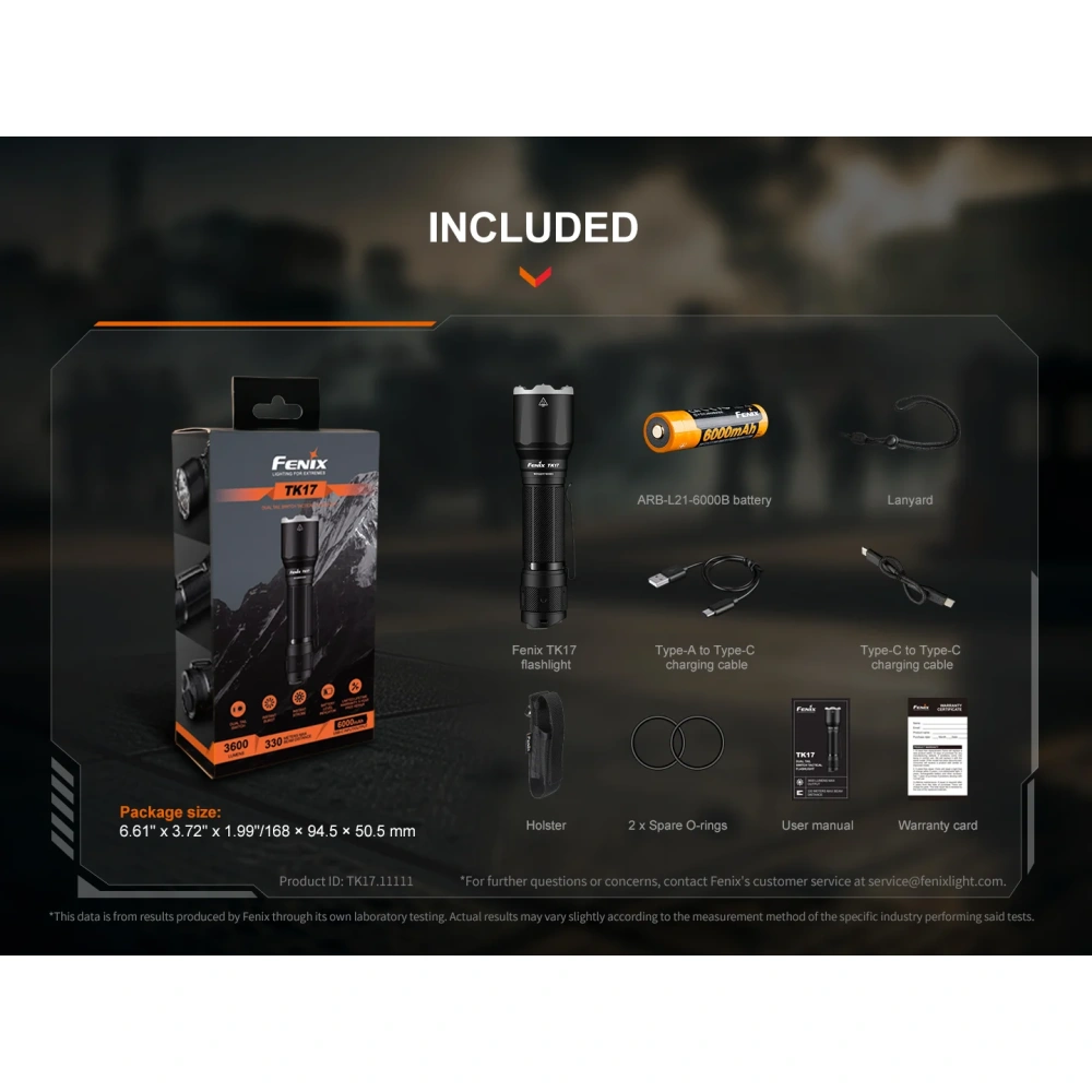TK17 näol on tegemist kerge, kompaktse ja lihtsa kasutajaliidesega taktikalise teenistuslambiga, mis sobib oma mõõtmetelt ning funktsionaalselt ideaalselt ka relvalambiks jahimehele. Fenix TK17 on kõigest 148,5mm pikk, 36mm pea läbimõõduga ning 25,4mm korpuse läbimõõduga. Lamp kasutab tööks uue generatsiooni suure mahutavusega (6000mAh) tüüp 21700 Li-ion akut, mille USB-C otselaetav versioon tuleb lambiga ostes kaasa. Aku laetustasemest annab märku toitelüliti lähedusse integreeritud laetustaseme indikaator. Maksimaalseks valgusjõuks on 3600 luumenit ning maksimaalseks valgusvoo ulatuseks 330m. Ülekuumenemise eest kaitseb lampi sisse ehitatud temperatuuriregulaator. Fenix TK17 on disainitud eelkõige professionaalseks kasutamiseks teenistuslambina korrakaitsesektoris. Sellele viitab ka lambi hästi balanseeritud valgusjoonis ning taktikaline kasutajaliides, mis koosneb lambi taha akutoru otsa paigaldatud kahest lülitist. Ühe lülitiga saab lülitada lampi tööle või siseneda otse stroborežiimi. Teine lüliti on valgustugevuste vahetamiseks. Kokku on TK17-l neli konstantset valgustugevust vahemikus 30-3600 luumenit ning stroborežiim. Lisaks on lambi pea esiosa varustatud tugevast roostevabast terasest löögiotstega. Nagu kõik kvaliteetsed teenistuslambid, on Fenix TK17 vee- ja ilmastikukindel (kaitseklass IP68 2m) ning testitud põrutuskindlusega. TK17 on kohanduv valiku Fenix'i lisavarustusega nagu distantslüliti, liiklusreguleerija sauad, vutlarid, relvakinnitused jne. Kui otsite omale kompaktset, kuid võimekat universaalset teenistus- või jahilampi, siis Fenix TK17 on kindlasti üks valikutest.