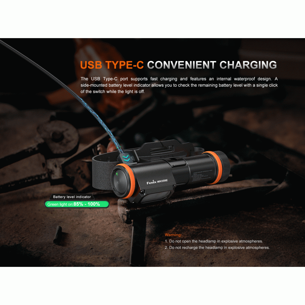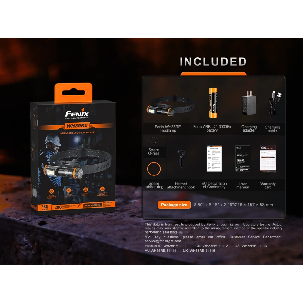 Fenix WH35RE on üllatavalt kompaktne. Koos peapaela kinnitusega on pikkuseks 112mm ning sügavuseks ja kõrguseks kõigest 45mm. Kaaluks koos toiteallikaga on 153g. Lambi maksimaalseks valgusjõuks on 280 luumenit ning valgusvoo ulatuseks 21 meetrit. Valgusjoonis on väga lai ning ühtlane ja mõeldud efektiivseks lähitööks. Saadaval on kokku neli valgustugevust: max.280lm tööajaga 6h, max.100lm tööajaga 14h, max.30lm tööajaga 64h ja max.5lm tööajaga kuni 280h. Lisaks on lambil peidetud SOS režiim. Valgusallikaks on kaks Cree XP-G3 NW neutraalse valge valgusega LED elementi. Neutraalne valge valgust toob paremini esile vaadeldava objekti detailid, suurendab kolmemõõtmelisuse efekti ning vähendab silmade väsimust kunstvalguses võrreldes külmemate valgustemperatuuridega. Tööks kasutab Fenix WH35RE uue generatsiooni suurt tüüp 21700 ATEX sertifitseeritud korduvlaetavat Li-ion akut. Aku on vajadusel vahetatav. Laadimiseks ei pea akut lambist eemaldama. See on otselaetav läbi lampi integreeritud laadimispesa. Lambi töörežiimide vahetamine toimub läbi mugava ja suure külglüliti. Kasutaja ohutuse tagamiseks on lambil sisse ehitatud aku laetustaseme indikatsioon olukordadeks, kus akus sisalduv energia hakkab ammenduma. Lambi korpus on valmistatud alumiiniumist ning kaetud korrosiooni kaitseks tüüp III anodeeringuga. Fenix WH35RE omab maksimaalset kaitseklassi IP66 ning on testitud põrutuskindlusega kukkumisel 2m kõrguselt. Lambi täiskomplekti kuuluvad lisaks lambile Fenix ARB-21-3000Ex ATEX sertifitseeritud aku, USB-C laadimiskaabel, vooluvõrgu adapter, tagavara rõngastihend, EU vastavussertifikaat ning kasutusjuhend.