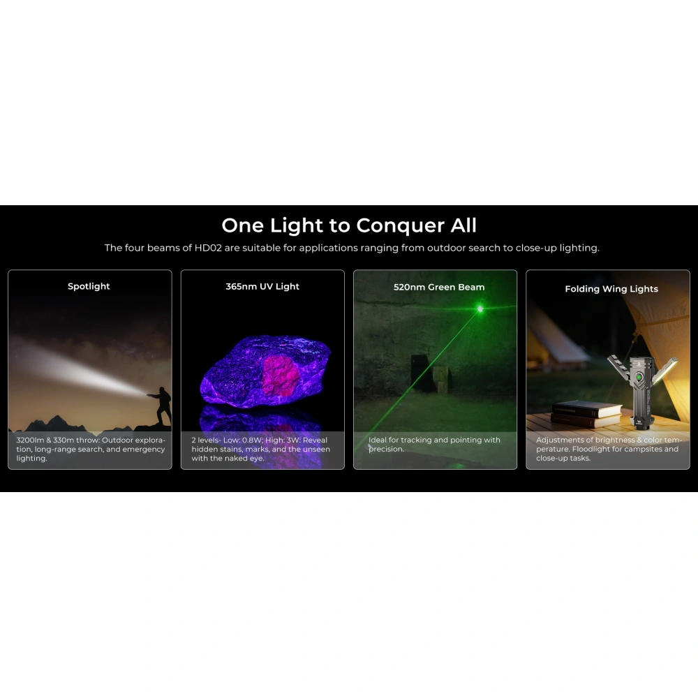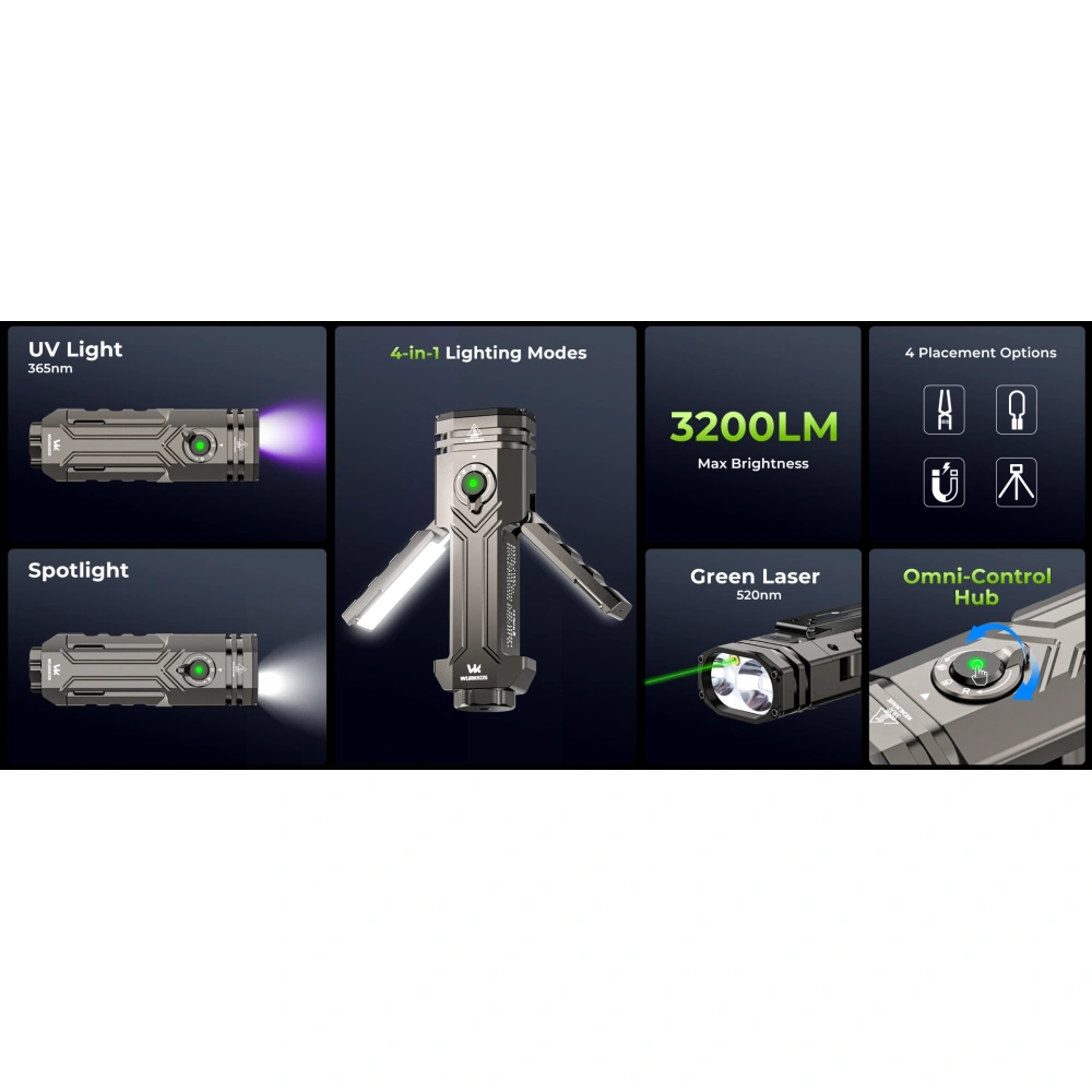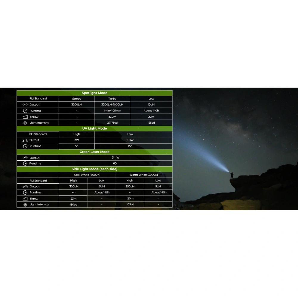 | Töörežiimid (ANSI FL1) | Sujuv dimmerdamine 0-100%. Põhivalgus: max 3200lm-1000lm@1min+105, min 10lm@140h. Hajus valgus: max 550lm@4h, min 5lm 145h. Roheline laser 3mW 60h. UV max 3W 5h, min 0,8W 15h |