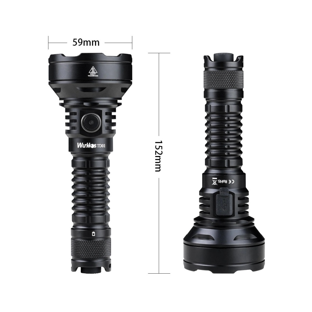 Wurkkos TD01C korpus on täielikult valmistatud alumiiniumisulamist, kaetud tüüp III tugeva anodeeringuga ning omab maksimaalset kaitseklassi IPX8. Lamp on testitud veekindlusega kuni 2m sügavusel ning põrutuskindlusega kukkumistele kuni 1m kõrguselt. Pikkuseks on 152mm, pea läbimõõduks 59mm, korpuse läbimõõduks 26mm ja kaaluks 200g ilma toiteallikata. Korpus on sale, libisemisvastase töötlusega ning suurendatud soojusjuhtivusega lambi esiosas driveri piirkonnas. Wurkkos TD01C toitesüsteem on üles ehitatud uuele premium-klassi buck draiverile, mis tagab võrreldes eelkäijaga parema valgustugevuse stabiliseerituse ning konstantse valgustugevuse erinevatel valgustugevustel. Maksimaalseks valgusjõuks on kuni 1800 luumenit ning maksimaalseks valgusvoo ulatuseks kuni 1000 meetrit (1km). LED elemendiks on populaarne ja võimekas Luminus SFT40 element. Valgusjoonis on otsingulambile omaselt konkreetne, väga teravalt kontsentreeritud keskosaga ning vähemvalgustatud äärealadega, et lähiobjektidelt tagasipeegelduv valgus ei hakkaks kaugele vaatamist segama. Wurkkos TD01C omab kokku kuute valgustugevust (1lm, 30lm, 150lm, 350lm, 800lm, 1800lm) ja strobo, SOS ning majakarežiimi. Toiteallikaks on uue generatsiooni vahetatav tüüp 21700 Li-ion aku, mis sisaldub komplektis. Lambis on võimalik kasutada pea kõiki saadaval olevaid kvaliteetseid 21700 Li-ion akusid (kaitsega ja kaitseta + flat-top ja button-top) v.a tavalisest pikemaid USB-laadimispesaga akusid. Akut ei pea laadimiseks lambist eemaldama. Aku laadimiseks on lambi küljele integreeritud USB-C otselaadimisport. Aku tühjenemisest ja laadimisprotsessist annab reaalajas märku lülitisse integreeritud kolmeastmeline aku tühjenemise ning aku laadimisprotsessi indikaator. Wurkkos TD01C opereerimine käib läbi kahe lüliti - lambi tagakorgile integreeritud nn taktikalise toitelüliti ja küljel asuva režiimilüliti kaudu. Lambil on olemas nii viimase valgustugevuse mälufunktsioon kui ka automaatne lambi töötemperatuuri järgiv süsteem ülekuumenemise kaitseks. Wurkkos TD01C tarnitakse täiskomplektina, kuhu kuuluvad lisaks lambile USB-C laadimiskaabel, tagavara rõngastihendid, käepael, kasutusjuhend ja tüüp 21700 5000mAh Li-ion aku.