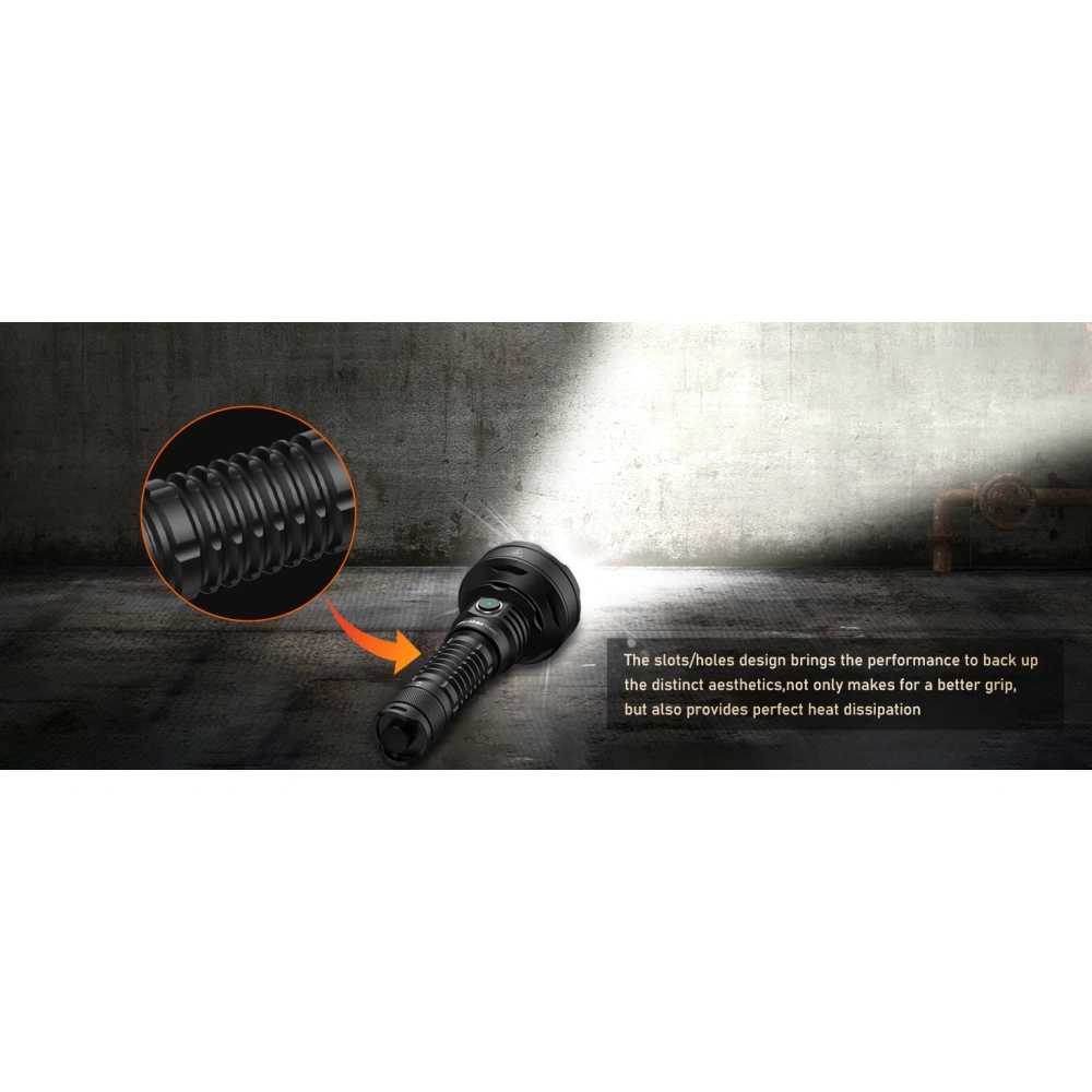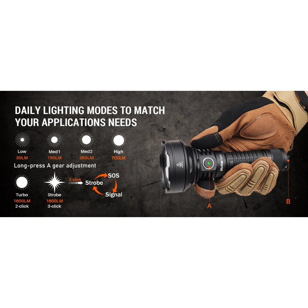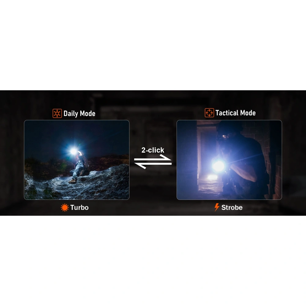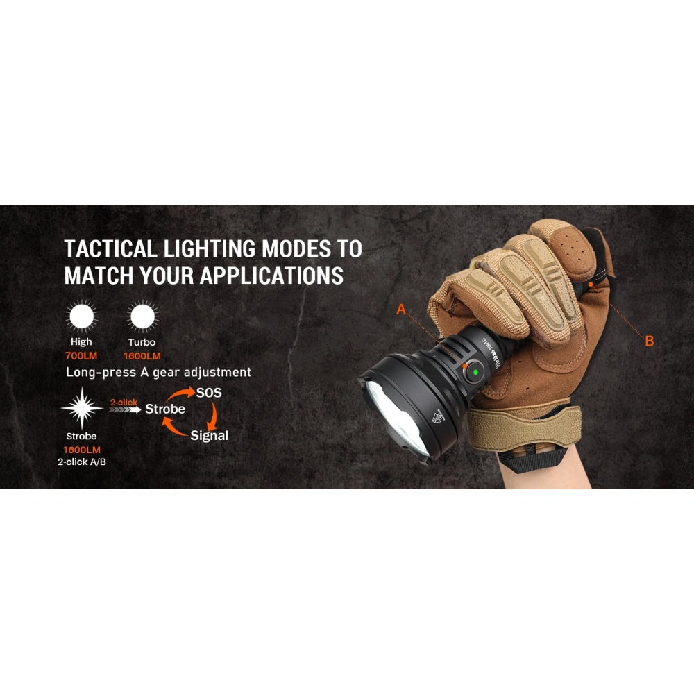 Töörežiimid (ANSI FL1) | 1lm@700h, 30lm@50h, 150lm@15h, 350lm@6,5h, 800lm@3h (sis.stepdown), 1800lm@2h (sis.stepdown), 1800lm strobo, 350lm SOS, 1800lm majakas |