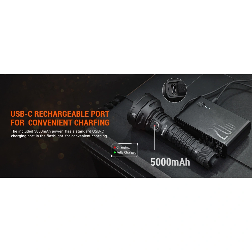 Komplekti kuulub | Lamp, USB-C laadimiskaabel, tagavara rõngastihendid, käepael, kasutusjuhend, tüüp 21700 5000mAh kaitseta flat-top Li-ion aku |