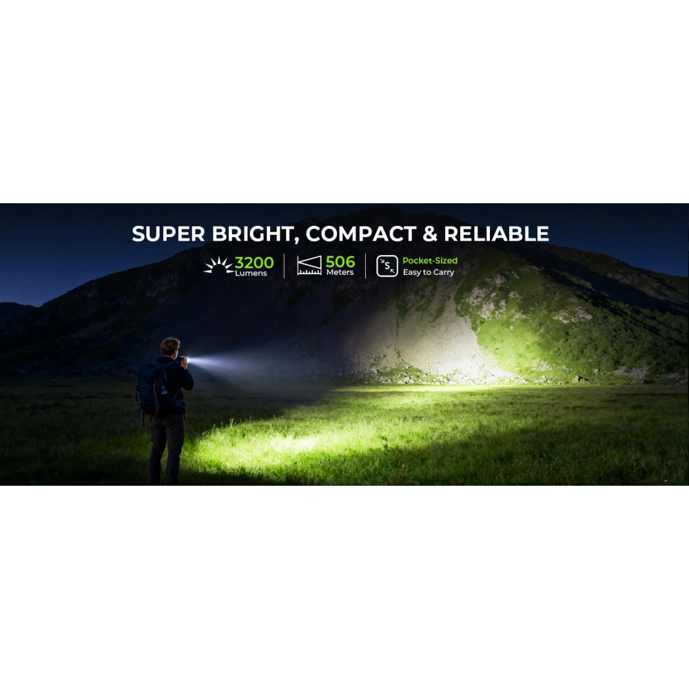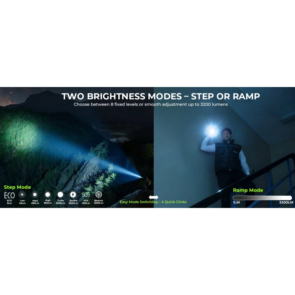 | Töörežiimid (ANSI FL1) | Sujuv dimmerdamine 0-100% + astmeline reguleerimine: 3lm@330h, 45lm@72h, 250lm@13,76h, 950lm-400lm-250lm@1,48h+1,42h+1,58h, 3200lm-950lm-400lm-250lm@1min+1,92h+0,58h+0,33h, 3200lm strobo, 250lm SOS, 3200lm majakas |