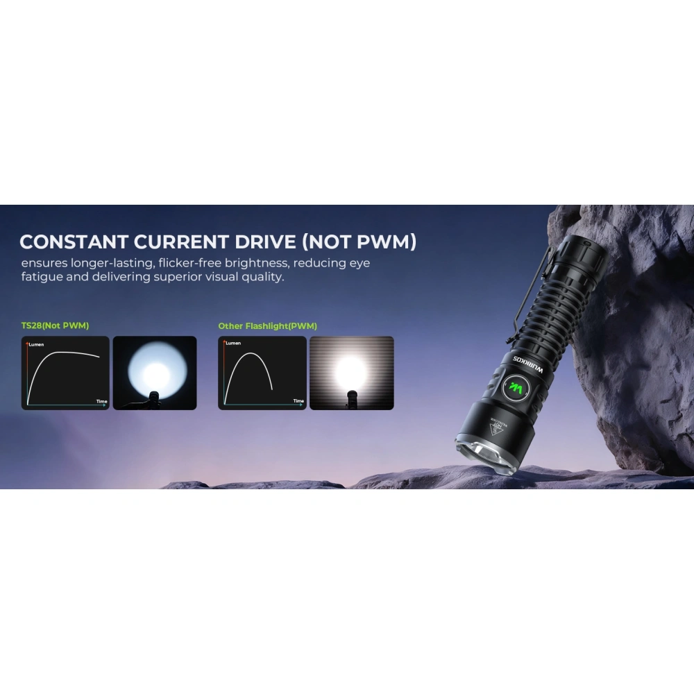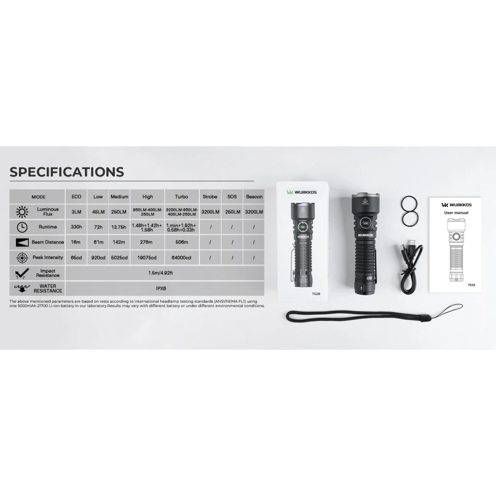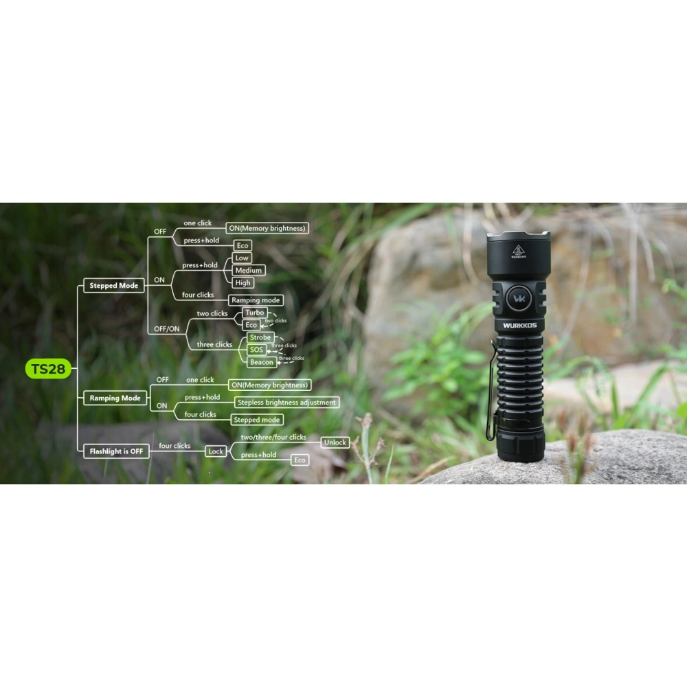 Wurkkos TS28 on ilmselt üks taskulambimaailma parima hinna-kvaliteedi suhtega kvaliteet-taskulampe. Tegemist on klassikalise kujuga kompaktse ja universaalse taskulambiga. TS28 on valmistatud tugevast alumiiniumisulamist ning kaetud tüüp III anodeeringuga. Lambi pea esiosa on varustatud tugeva roostevabast terasest kaitserõngaga ning tagaossa on integreeritud tugev kinnitusmagnet lambi kinnnitamiseks ferromagneetilistele pindadele. Wurkkos TS28 pikkuseks on 128mm ning pea läbimõõduks 36mm. Lambi korpus on täielikult vee- ja ilmastikukindel ning vastab kõrgeimale kaitseklassile IPX8. Maksiaalseks valgustugevuseks on kuni 3200 luumenit ning valgusvoo ulatuseks kuni 506 meetrit. Valgustugevusi on võimalik muuta astmeliselt (viis valgustugevust pluss kolm erirežiimi) või dimmerdada sujuvalt vahemikus 0-100%. Lambi toitesüsteem on tänu premium-klassi draiverile (Boost Constant Current) täielikult stabiliseeritud. Toiteallikana kasutab Wurkkos TS28 laialdaselt kasutusel olevaid tüüp 21700 Li-ion akusid. Sobivad nii flat-top kui button top akud ning nii kaitsega kui kaitseta akud. Lambi laadimiseks ei pea akut eemaldama, vaid see on võimalik läbi lampi integreeritud standardse USB-C laadimispesa. Lisaks töötab lambi aku läbi laadimispesa ka akupangana väliste seadmete laadimiseks, kui see vajalikuks peaks osutuma. Lisaks on TS28 varustatud valesti sisestatud aku kaitsega, madala toitepinge hoiautsega ning aku laetustaseme indikaatoriga. Wurkkos TS28 täiskomplekti kuuluvad lamp, Wurkkose 5000mAh mahutavusega tüüp 21700 li-ion aku, laadimiskaabel, tagavara rõngastihendid ning käepael.