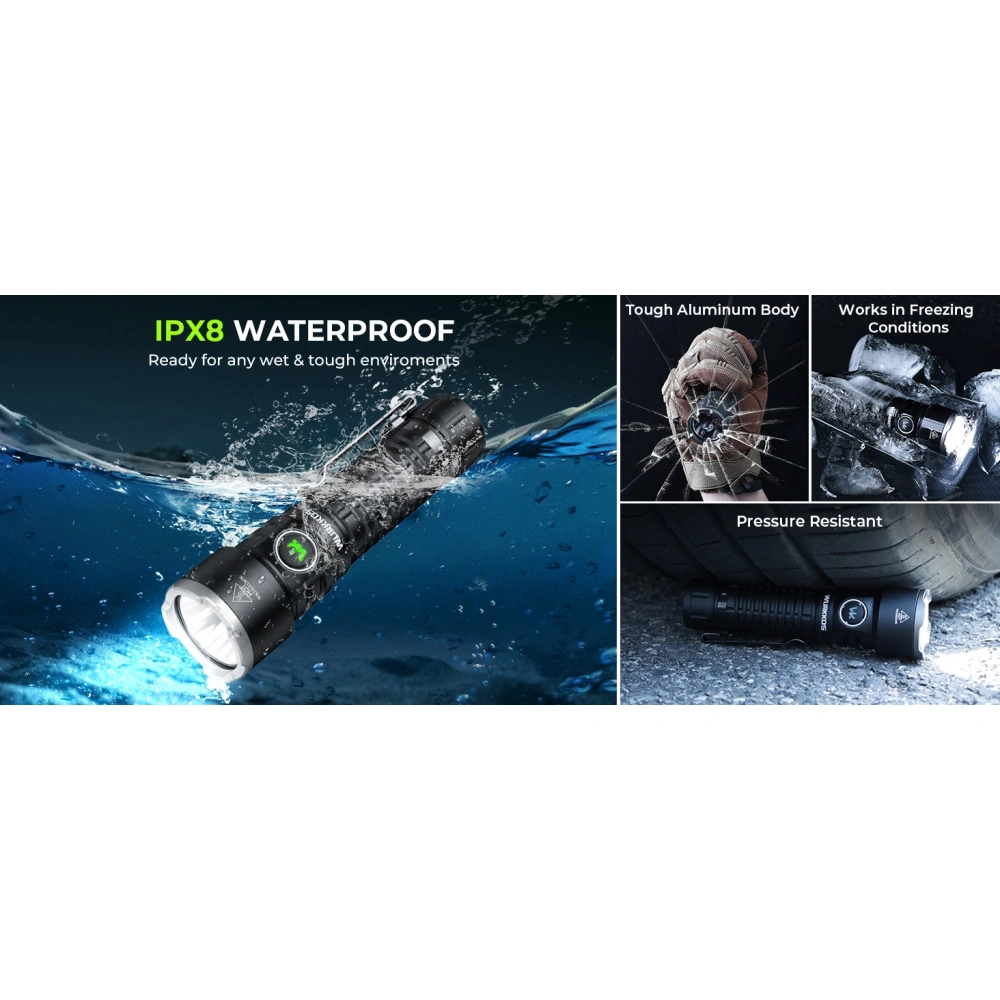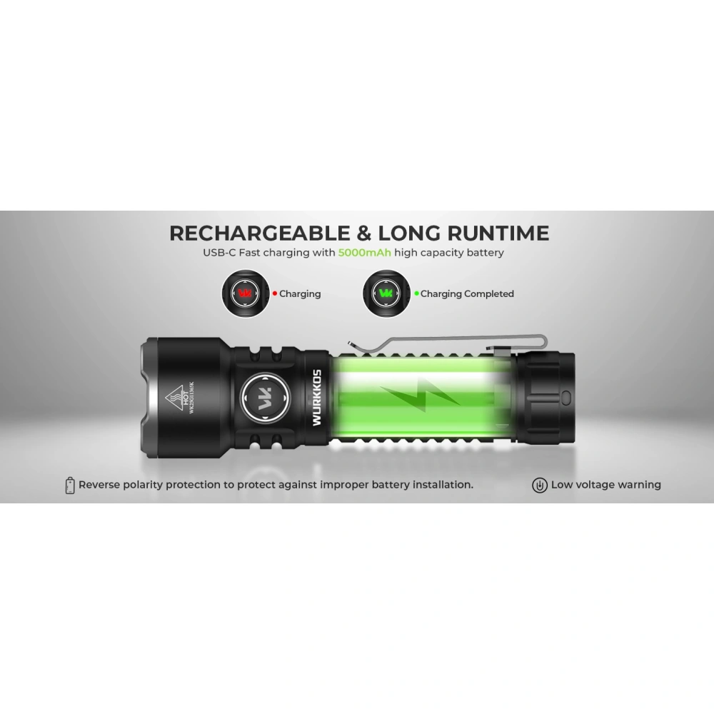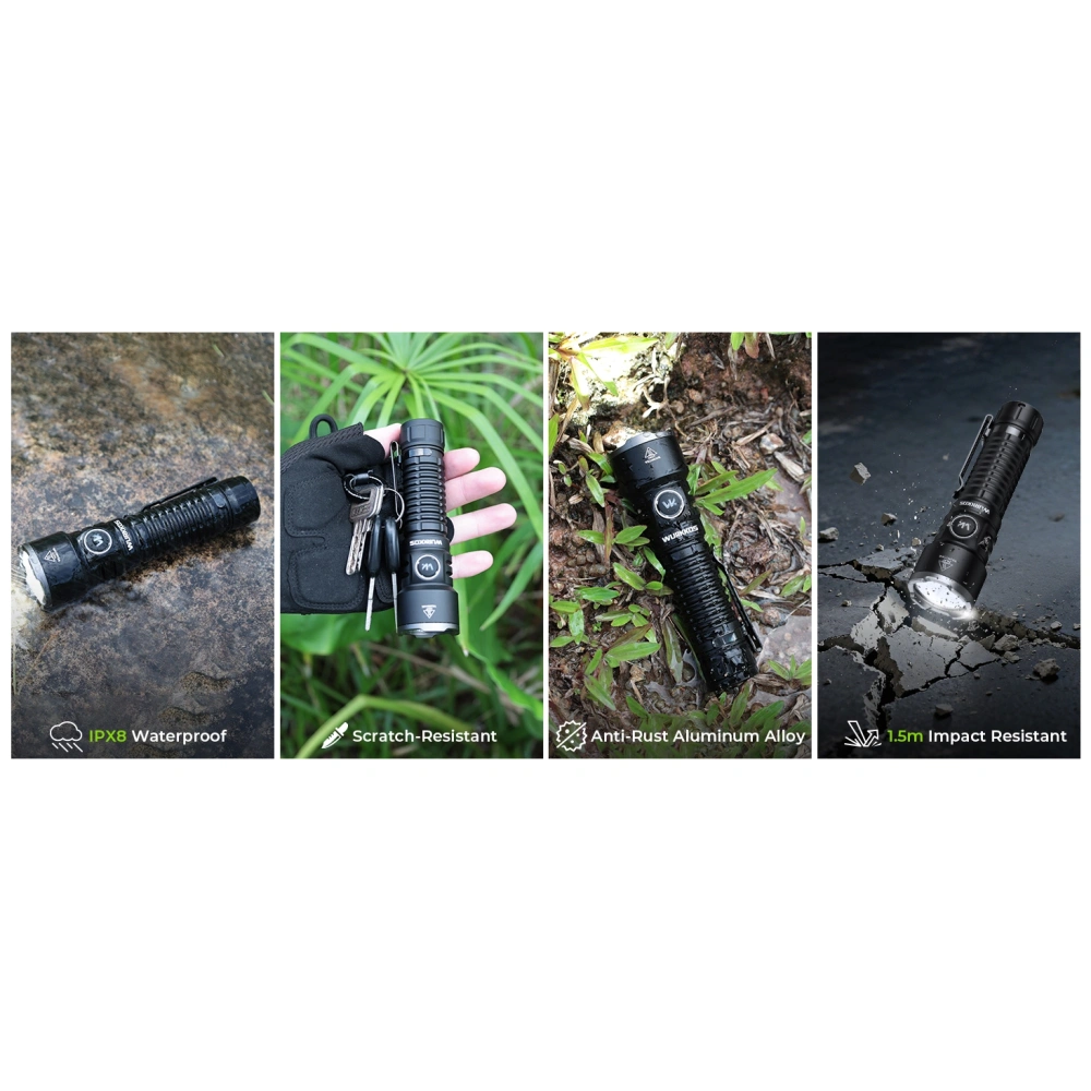 | Komplekti kuulub | Lamp, Wurrkose tüüp 21700 5000mAh Li-ion aku, USB-C laadimiskaabel, taskuklamber, käepael, tagavara rõngastihendid, kasutusjuhend |